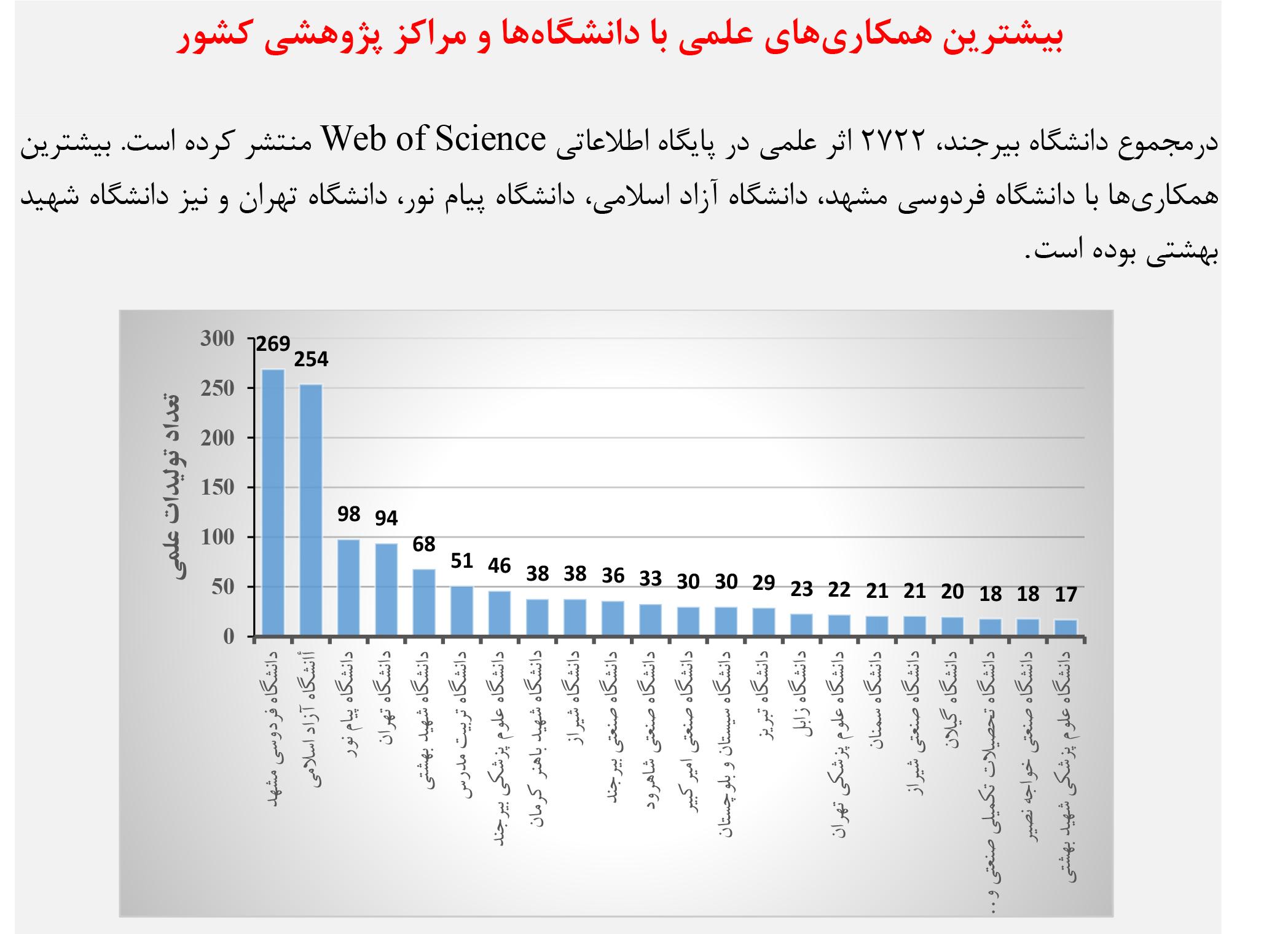 دانشگاه بیرجند در بخش همکاریهای علمی با دانشگاهها و مراکز پژوهشی کشور 2722 اثر علمی در پایگاه Science Web of منتشر کرده است. بیشترین همکاریها با دانشگاه فردوسی مشهد، دانشگاه آزاد اسلامی، دانشگاه پیام نور، دانشگاه تهران و نیز دانشگاه شهید بهشتی بوده است.