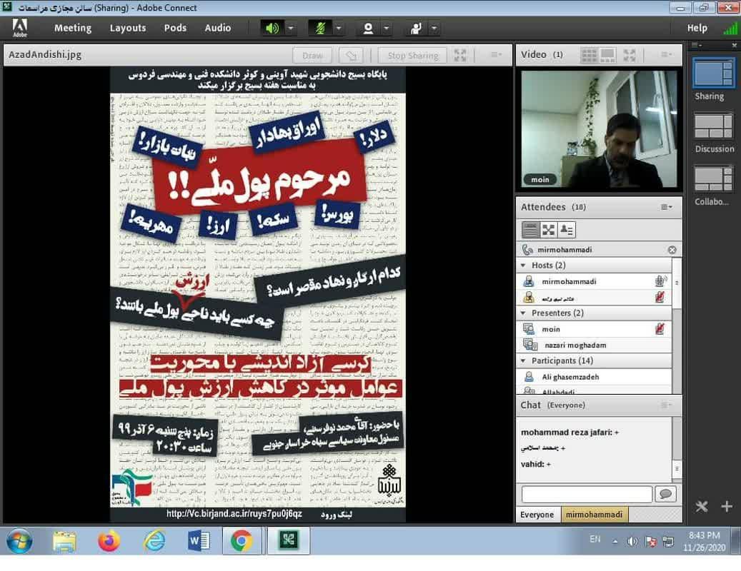 به گزارش روابط عمومی و اطلاع‌رسانی دانشگاه بیرجند، کرسی آزاداندیشی با موضوع عوامل موثر در کاهش ارزش پول ملی با حضور محمد نوفرستی، مسئول معاونت سیاسی سپاه پاسداران خراسان جنوبی به مناسبت بزرگداشت هفته بسیج توسط دانشکده فنی و مهندسی فردوس به صورت مجازی برگزار شد.