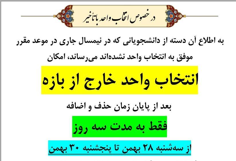 انتخاب واحد خارج از بازه؛ سه روز بعد از حذف و اضافه ۱۵ بهمن ۱۳۹۹ | ۱۸:۱۶ کد : ۱۱۸۱۴ اطلاعیه ها اطلاعیه دانشجویی ارسال به دیگران نام شما ایمیل شما ایمیل دریافتکننده ارسال انصراف تعداد بازدید:۸۳۷۱