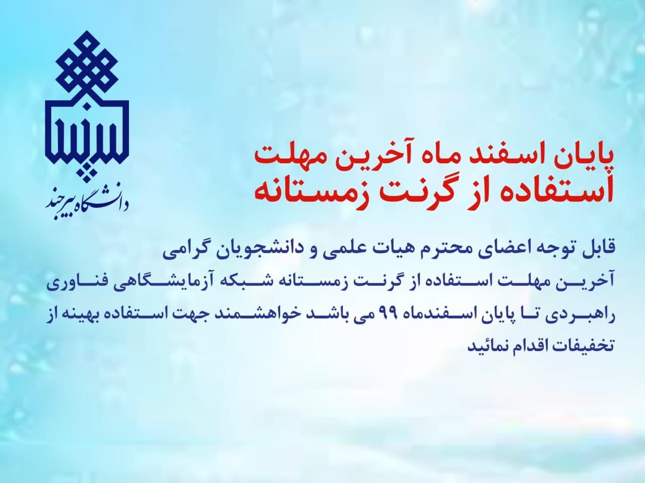 پایان اسفند ماه آخرین مهلت استفاده از گرنت زمستانه ۰۳ اسفند ۱۳۹۹ | ۱۷:۳۴ کد : ۱۲۱۲۷ اطلاعیه ها اطلاعیه دانشجویی ارسال به دیگران نام شما ایمیل شما ایمیل دریافتکننده ارسال انصراف تعداد بازدید:۷۳۰۵