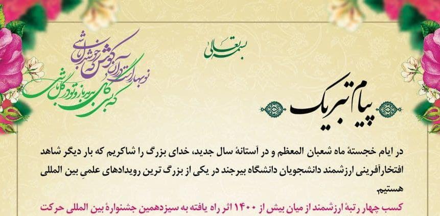 به مناسبت کسب افتخار انجمنهای علمی دانشجویی دانشگاه در سیزدهمین جشنواره بینالمللی حرکت صادر شد؛ پیام تبریک معاون فرهنگی و اجتماعی دانشگاه بیرجند ۲۶ اسفند ۱۳۹۹ | ۲۰:۴۸ کد : ۱۲۴۷۴ اخبار دانشکدهها اخبار ستادی ارسال به دیگران نام شما ایمیل شما ایمیل دریافتکننده ارسال انصراف تعداد بازدید:۸۰۹۲ دکتر علی زنگوئی، معاون فرهنگی و اجتماعی دانشگاه با صدور پیامی تبریکی کسب افتخار انجمنهای علمی دانشجویی دانشگاه در سیزدهمین جشنواره بین المللی حرکت را تبریک گفت.