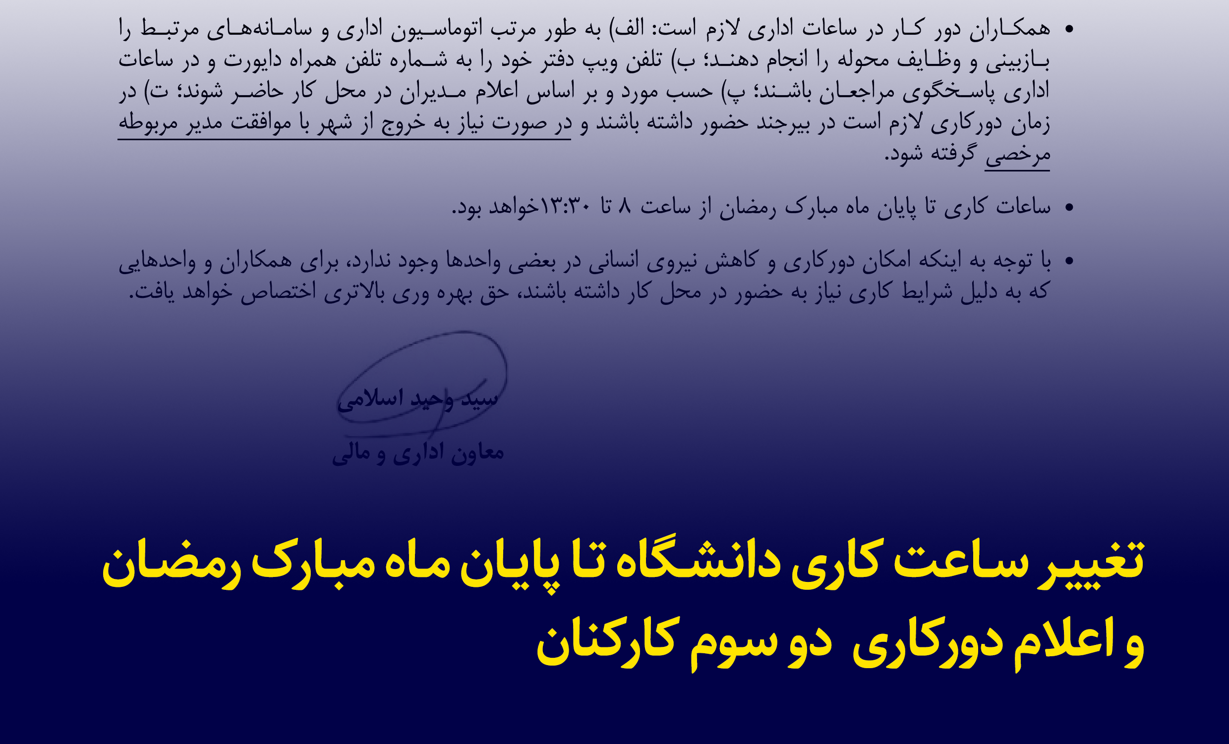 تغییر ساعت کاری دانشگاه تا پایان ماه مبارک رمضان و اعلام دورکاری دو سوم کارکنان