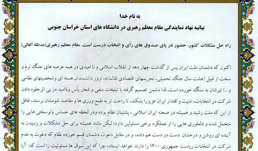 بیانیه نهاد نمایندگی مقام معظم رهبری در دانشگاه های خراسان جنوبی مبنی بر مشارکت حداکثری ۲۵ خرداد ۱۴۰۰ | ۱۵:۳۰ کد : ۱۳۴۱۴ اخبار ستادی ارسال به دیگران نام شما ایمیل شما ایمیل دریافتکننده ارسال انصراف تعداد بازدید:۶۵۲۷