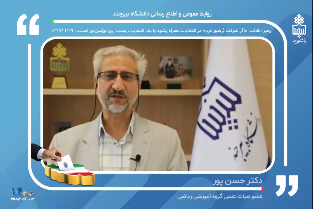 دعوت اساتید دانشگاه بیرجند جهت حضور پرشور در انتخابات ۲۸ خرداد | دکتر حسن پور ۲۶ خرداد ۱۴۰۰ | ۱۰:۰۹ کد : ۱۳۴۱۹ اخبار ستادی ارسال به دیگران نام شما ایمیل شما ایمیل دریافتکننده ارسال انصراف تعداد بازدید:۷۳۱۵