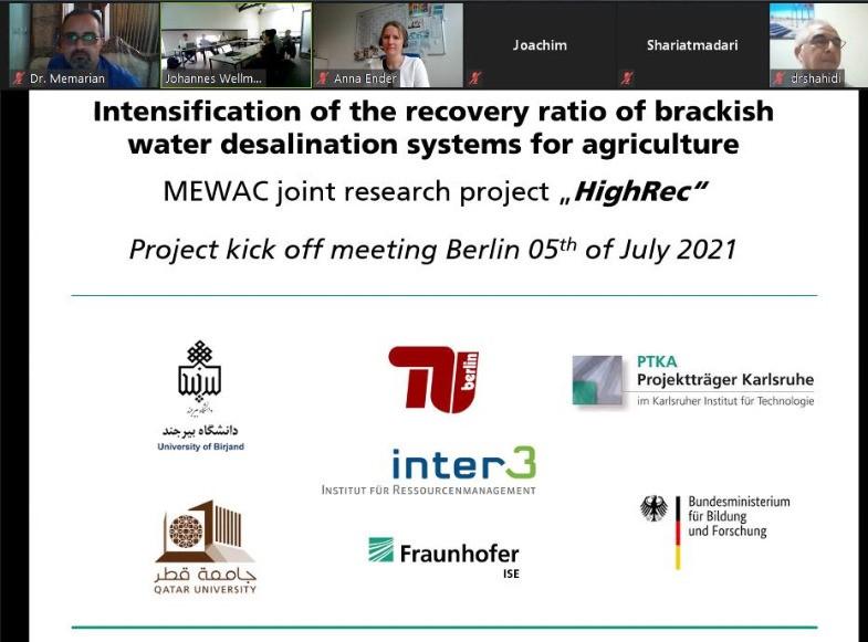 اولین جلسه از پروژه بین المللی HighRec (شیرین سازی آب های نامتعارف جهت مصارف کشاورزی) با معرفی طرف‌های ایرانی (دانشگاه بیرجند و دانشگاه صنعتی اصفهان)، قطری (دانشگاه قطر) و آلمانی (دانشگاه صنعتی برلین، موسسه تحقیقاتی inter۳ و موسسه تحقیقاتی فرانهوفر) روز دوشنبه ۱۴ تیر ۱۴۰۰در محل دانشگاه برلین به صورت فیزیکی برای سه طرف آلمانی و مجازی برای سایرین برگزار گردید.