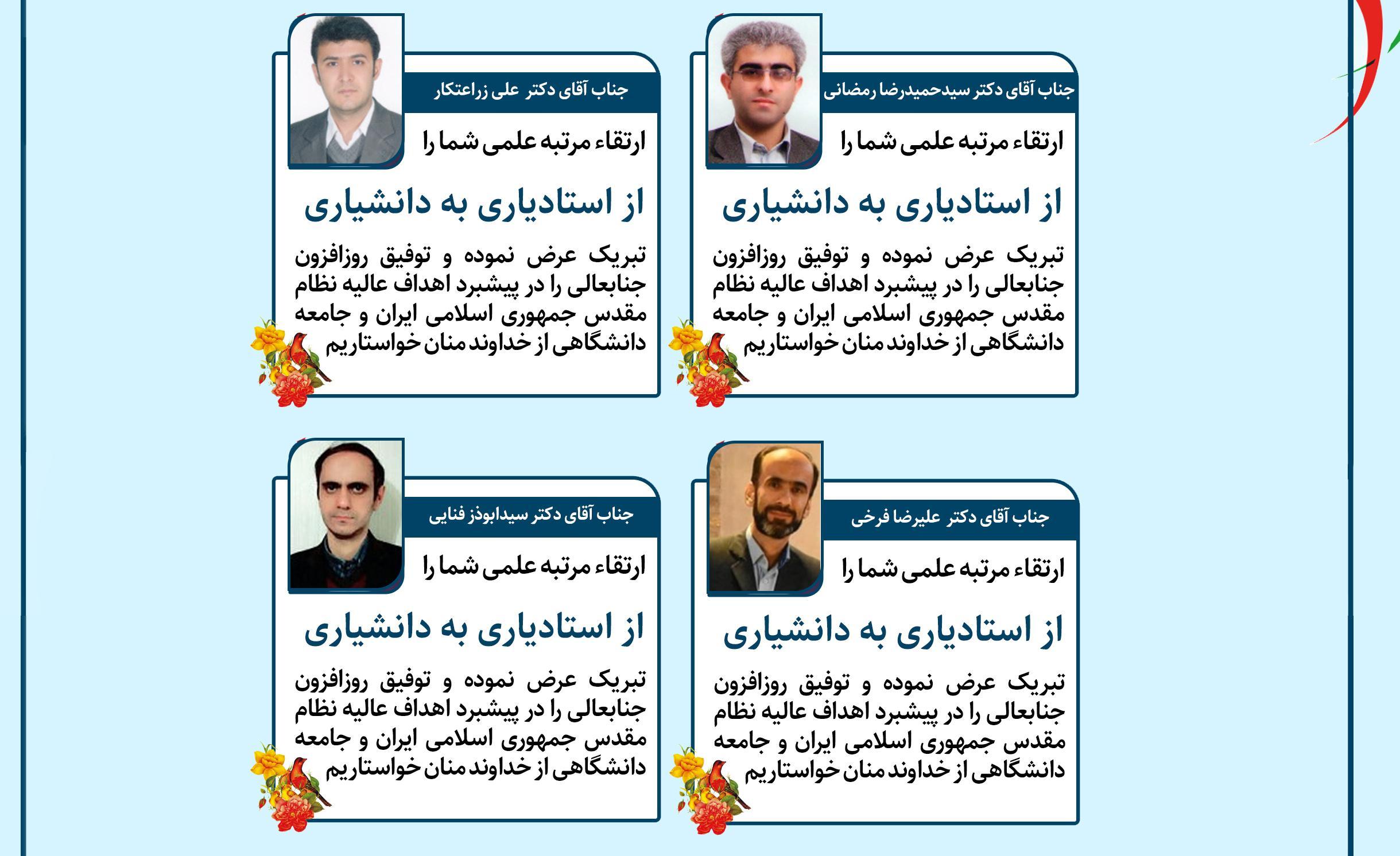روابط عمومی و اطلاعرسانی دانشگاه بیرجند ضمن تبریک به جامعه دانشگاهی، از خداوند متعال برای این اساتید محترم و فرهیخته آرزوی توفیق روز افزون و تداوم موفقیتها در کسب درجات علمی بالاتر را خواستار است.