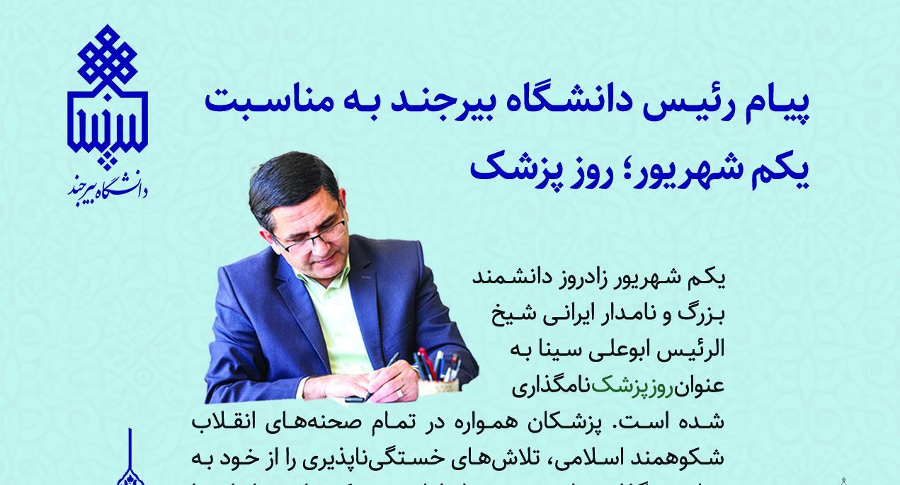 به گزارش روابط عمومی و اطلاعرسانی دانشگاه بیرجند، دکتر احمد خامسان رئیس دانشگاه بیرجند، طی پیامی یکم شهریور روز پزشک را گرامی داشت.