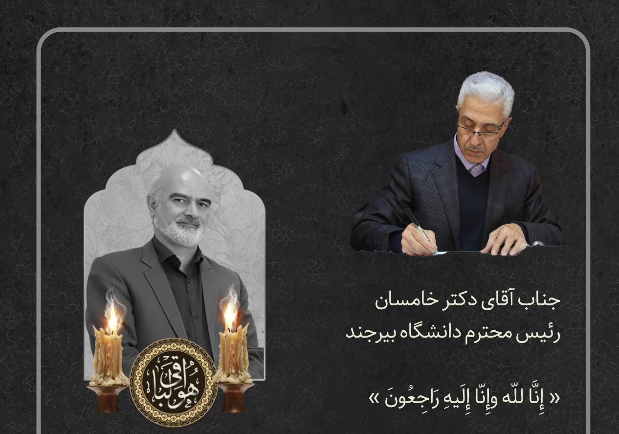 عروج این استاد و همکار فرهیخته را به جنابعالی، خانواده محترم آن مرحوم، همکاران، دانشجویان و اساتید معزز دانشگاه بیرجند و جامعه علمی و دانشگاهی کشور تسلیت عرض نموده و از درگاه پروردگار متعال برای آن زندهیاد، غفران و رحمت واسعه الهی و برای بازماندگان صبر و شکیبایی مسئلت مینمایم. روحشان شاد و یادشان گرامی