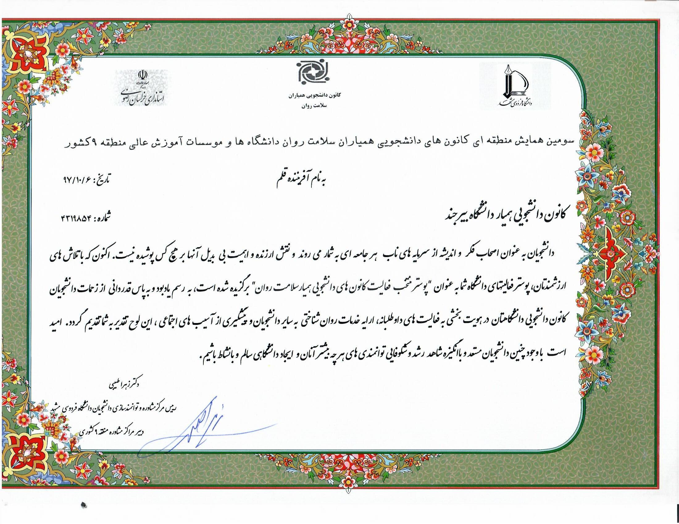 در سومین همایش منطقه ای کانون های همیاران سلامت روان دانشگاه های کشور پوستر کانون همیاران سلامت دانشگاه بیرجند مقام اول را کسب کرد.