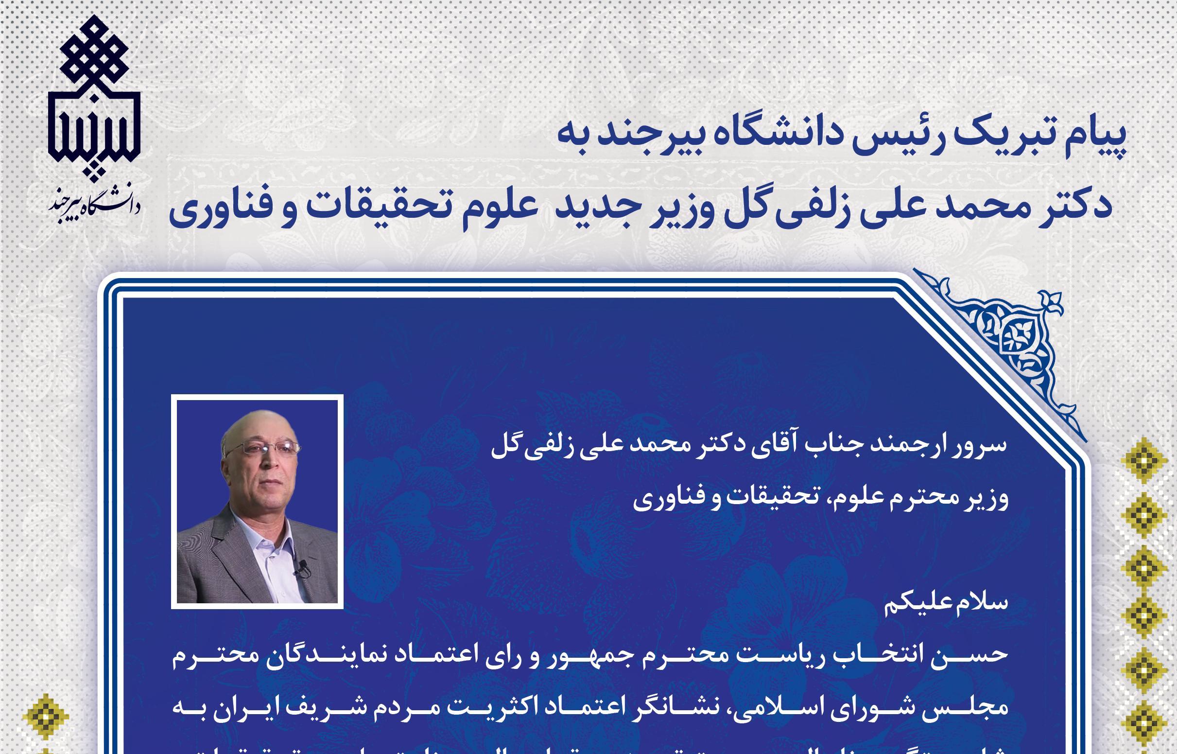 پیام تبریک رئیس دانشگاه بیرجند به دکتر محمد علی زلفیگل وزیر جدید علوم تحقیقات و فناوری