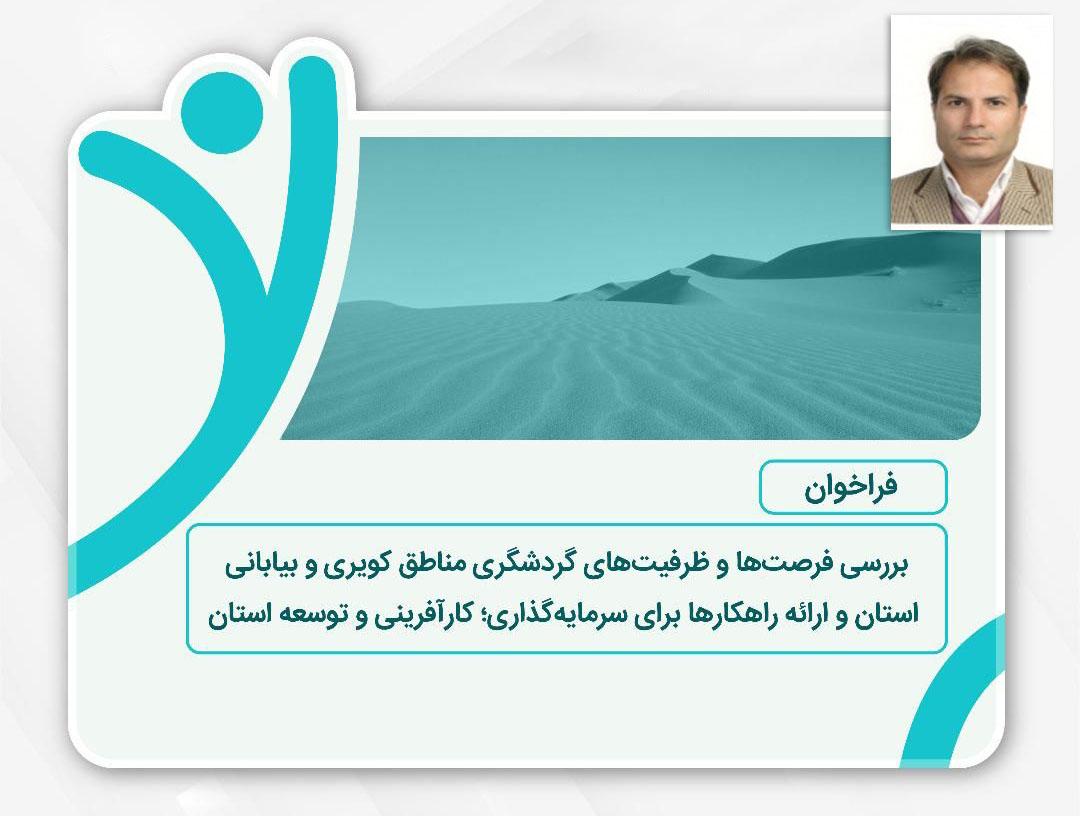 فراخوان بررسی فرصتها و ظرفیتهای گردشگری مناطق کویری و بیابانی استان و ارایه راهکارها برای سرمایهگذاری؛ کارآفرینی و توسعه استان