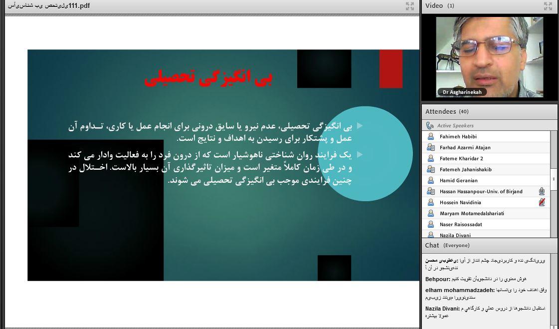 در این وبینار، دکتر سیدمسحن اصغری نکاح عضو هیأت علمی گروه روانشناسی مشاوره و تربیتی دانشگاه فردوسی مشهد مروری بر وضعیت موجود و چالش‌های مسائل تحصیلی-روان‌شناختی دانشجویان پرداخت و در ادامه ماهیت چند وجهی پیشرفت و افت تحصیلی – پژوهشی، فرایند مداخله در افت تحصیلی- پژوهشی و راهبردهای مواجهه مؤثر، مسایل انگیزشی-هیجانی رایج در دانشجویان (بی‌انگیزگی تحصیلی، استرس، افسردگی، رفتارهای مشکل زا ، فنون و راهبردهای توانمندسازی: (مهارتهای مطالعه و پژوهش، هدف‌گذاری، آمادگی برای امتحانات، مدیریت فضای مجازی)، فنون و راهبردهای توانمندسازی : (مدیریت هیجانی، مدیریت وقت، برنامه‌ریزی و تعاملات اجتماعی و فوق برنامه)، نقش و جایگاه اساتید در تعامل با مراکز مشاوره و حرفه‌های یاورانه را برشمرد.
