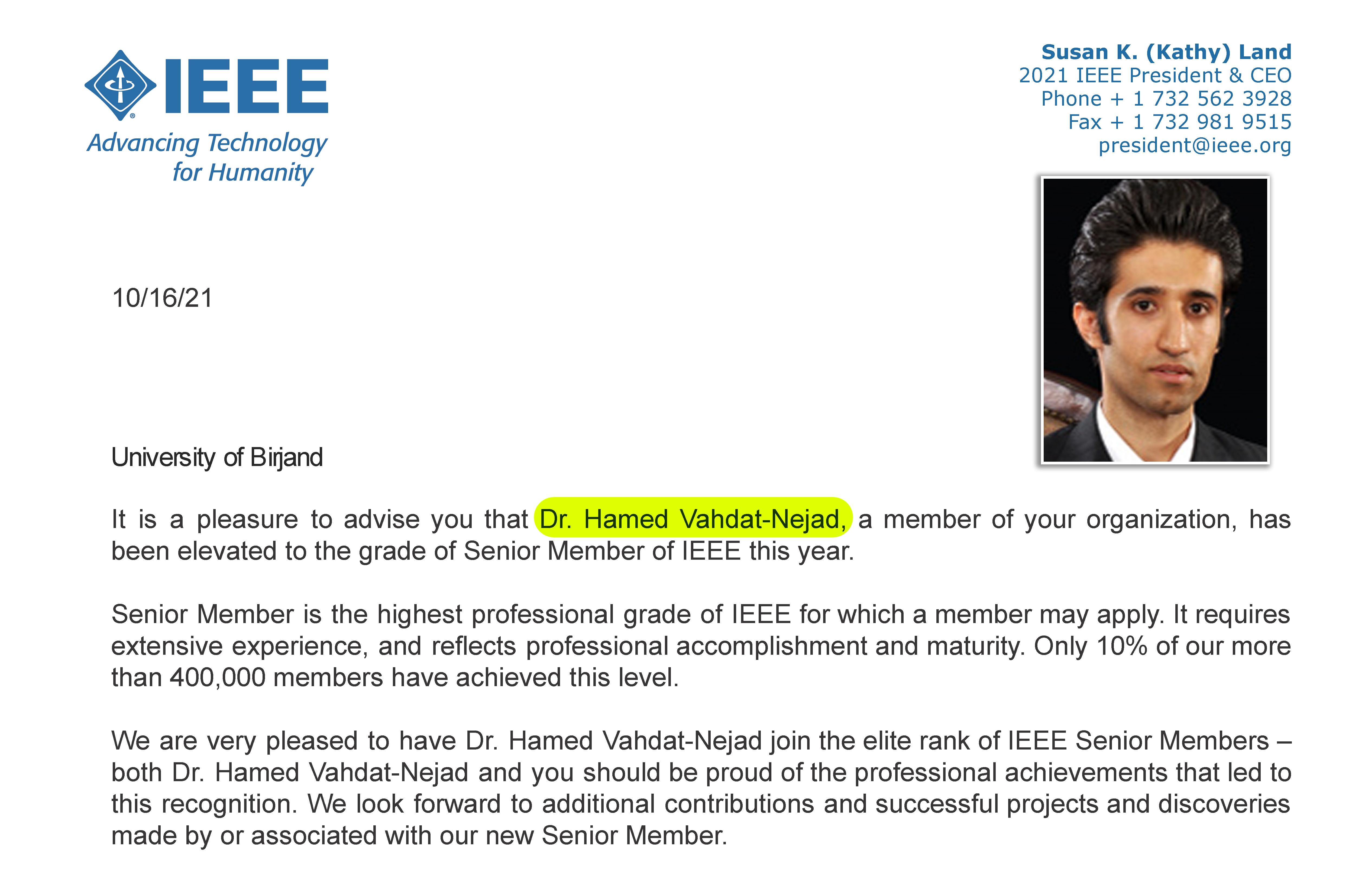 به گزارش روابط عمومی و اطلاعرسانی دانشگاه بیرجند دکتر حامد وحدت نژاد، عضو هیات علمی گروه مهندسی کامپیوتر و فناوری اطلاعات به عضویت ارشد IEEE (Senior membership)ارتقا یافت. IEEE معتبرترین و بزرگ ترین موسسه بین المللی حرفه ای علمی در حوزه مهندسی برق و کامپیوتر است و مرکز آن در ایالات متحده آمریکا قرار دارد. این موسسه ناشر مجلات تخصصی معتبر و کنفرانس های متعدد بین المللی در شاخه های مختلف مهندسی است. درحال حاضر ده درصد از محققان عضو IEEE، عضو ارشد هستند.