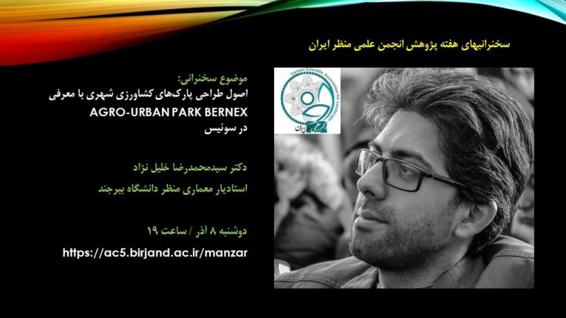 به گزارش روابط عمومی و اطلاعرسانی دانشگاه بیرجند، در این نشست علمی دکتر خلیلنژاد ضمن معرفی پارکهای کشاورزی در اروپا با تمرکز بر آگروپارک برنیکس چگونگی موفقیت این طرح را در مسابقه طراحی منظر را تشریح نمود. طراح این پارک دفتر طراحی VerzoneWood در سوئیس است که در یک مسابقه بین المللی معماری منظر برنده شد. مطابق تجربه آگروپارک برنیکس، از جمله اصول مهمی که در طراحی پارکهای کشاورزی شهری باید مدنظر طراحان منظر قرار بگیرد عبارتند از: اولویت در طراحی منظر با قابلیت کشاورزی، پلان ساده و کاربردی، توجه به دسترس پذیری و نظام سیرکولاسیون، توجه به ایجاد رابطه بصری بین ناظر و منظر کشاورزی، توجه به برندسازی منظر، دور نکردن بازدیدکنندگان از منظر کشاورزی، نامناسب بودن پلانهای انتزاعی و پست مدرن، تنوع نظام کاشت و گیاهان مثمر، توجه به نیازهای سنی مختلف.