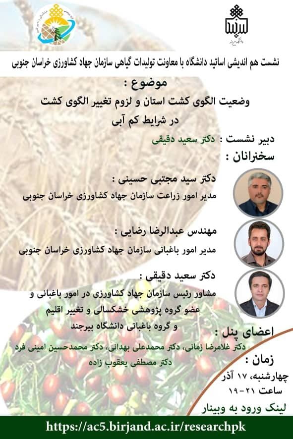 نشست وضعیت الگوی کشت استان خراسان جنوبی و لزوم تغییر الگوی کشت در شرایط کم آبی ۱۶ آذر ۱۴۰۰ | ۰۸:۵۰ کد : ۱۶۰۰۴ اطلاعیه ها ارسال به دیگران نام شما ایمیل شما ایمیل دریافتکننده ارسال انصراف تعداد بازدید:۴۶۲۵