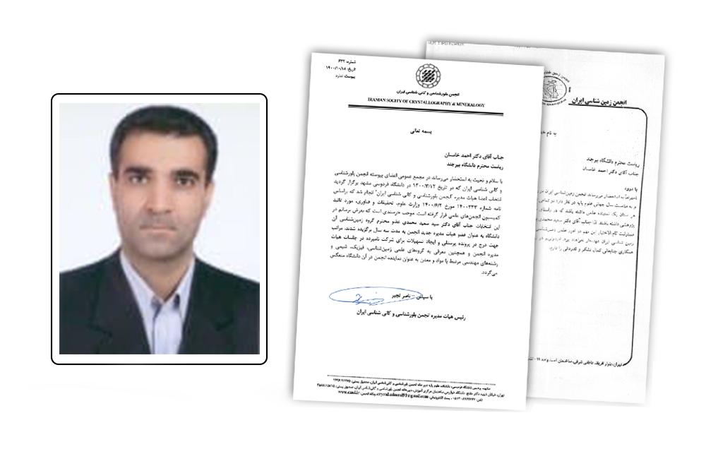 انتخاب عضو هیأت علمی دانشگاه بیرجند بهعنوان عضو هیأت مدیره انجمن بلورشناسی و کانیشناسی ایران و نماینده انجمن زمین شناسی ایران در خراسان جنوبی