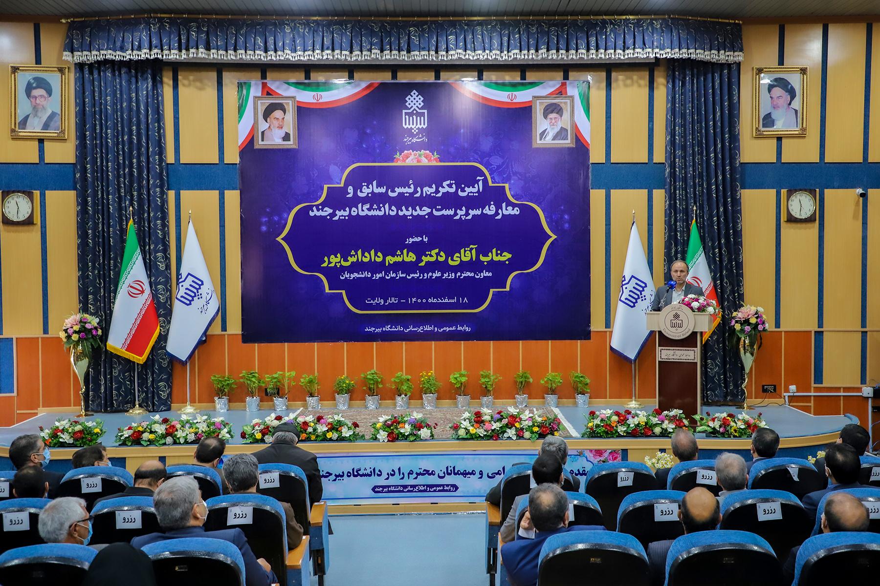 به گزارش روابط عمومی و اطلاعرسانی دانشگاه بیرجند، معاون وزیر علوم، تحقیقات و فناوری و رئیس سازمان امور دانشجویان با بیان اینکه اکنون ۳۰ درصد مجموع دانشجویان کشور در مقطع تحصیلات تکمیلی هستند، گفت: شهر دانشجویی باید پاسخگوی تقاضاهای ملی و محلی خود نیز باشد. دکتر هاشم داداشپور، با اعلام اینکه در مقطعی با افزایش شدید جمعیت جوان و دانشجویی مواجه شدیم و متناسب با آن تعداد دانشگاهها و مراکز آموزش عالی کشور نیز به شدت افزایش یافت، تصریح کرد: اکنون که روند جمعیت دانشجویی در دانشگاهها کاهنده شده، طبیعی است روند دانشگاهها به سمت تجمیع و تمرکز بیشتر حرکت کند چون منابع گستردهای برای توزیع در سراسر محیط دانشگاهی نداریم. وی با بیان اینکه دانشگاه بیرجند جزو محدود یا تنها دانشگاهی بوده که شهرک دانشگاهی است، افزود: به این دلیل که مجموعه اساتید جزئی از این دانشگاه محسوب میشوند و اتصال و پیوند بین خانواده و دانشگاه مشهود بوده، فرصت بینظیری است.