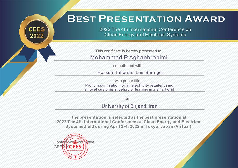 به گزارش روابط عمومی و اطلاعرسانی دانشگاه بیرجند، دکتر محمدرضا آقاابراهیمی، عضو هیأت علمی گروه آموزشی برق و قدرت و حسین طاهریان دانشجوی مقطع دکتری و لوییس بارینگو ازاسپانیا با ارائه مقاله Profit maximization for an electricity retailer using a novel customers' behavior leaning in a smart grid به چهارمین کنفرانس بین المللی انرژی پاک و سیستمهای الکتریکی(توکیوی ژاپن) عنوان بهترین ارائه را در این کنفرانس بین المللی بدست آوردند.