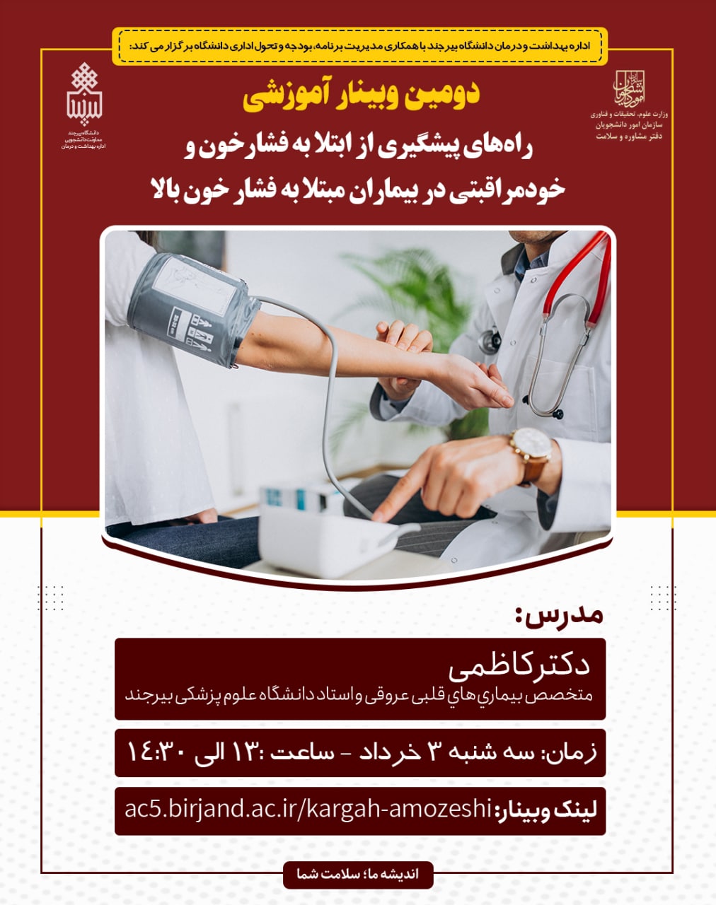 دومین وبینار آموزشی راه های پیشگیری از ابتلا به فشارخون و خودمراقبتی در بیماران مبتلا به فشارخون بالا ۰۲ خرداد ۱۴۰۱ | ۱۰:۱۰ کد : ۱۸۶۵۴ اطلاعیه ها ارسال به دیگران نام شما ایمیل شما ایمیل دریافتکننده ارسال انصراف تعداد بازدید:۴۶۴۰