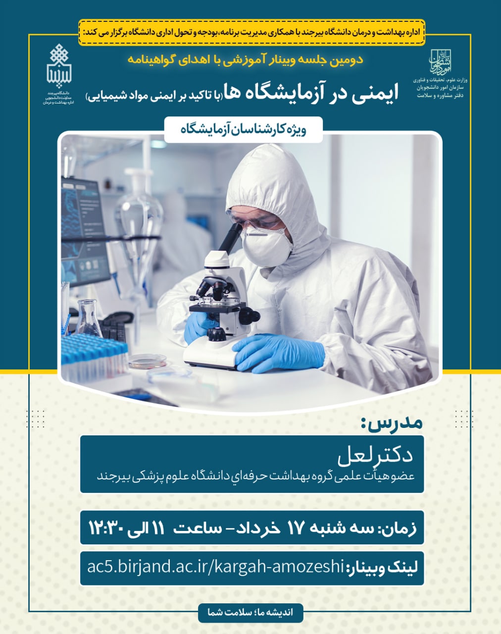 دومین وبینار آموزشی ایمنی در آزمایشگاه ها (با تاکید بر ایمنی مواد شیمیایی) ۱۶ خرداد ۱۴۰۱ | ۱۲:۵۹ کد : ۱۸۹۰۹ اطلاعیه ها ارسال به دیگران نام شما ایمیل شما ایمیل دریافتکننده ارسال انصراف تعداد بازدید:۴۶۷۸