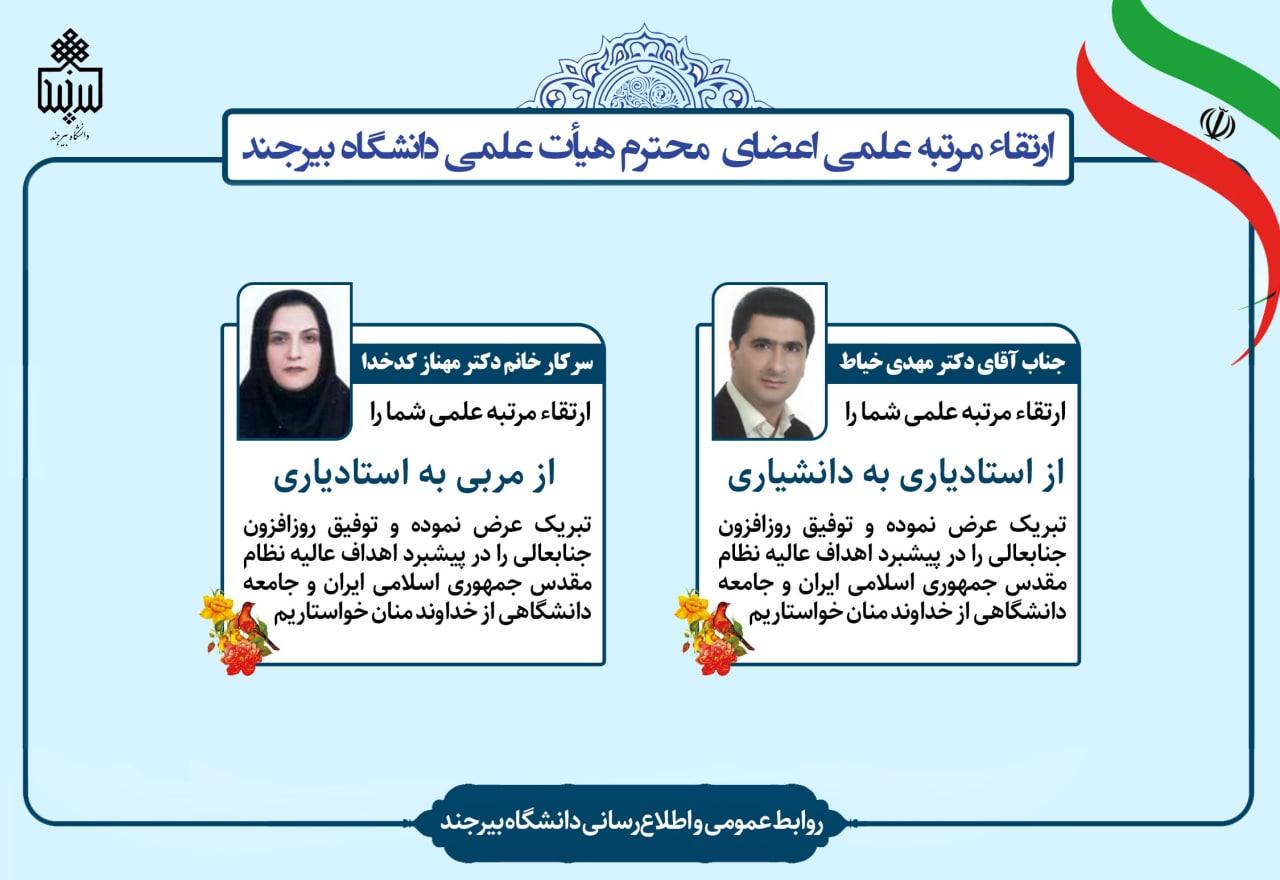 روابط عمومی و اطلاعرسانی دانشگاه بیرجند ضمن تبریک به جامعه دانشگاهی، از خداوند متعال برای اعضای هیأت علمی محترم و فرهیخته آرزوی توفیق روز افزون و تداوم موفقیتها در کسب درجات علمی بالاتر را خواستار است.