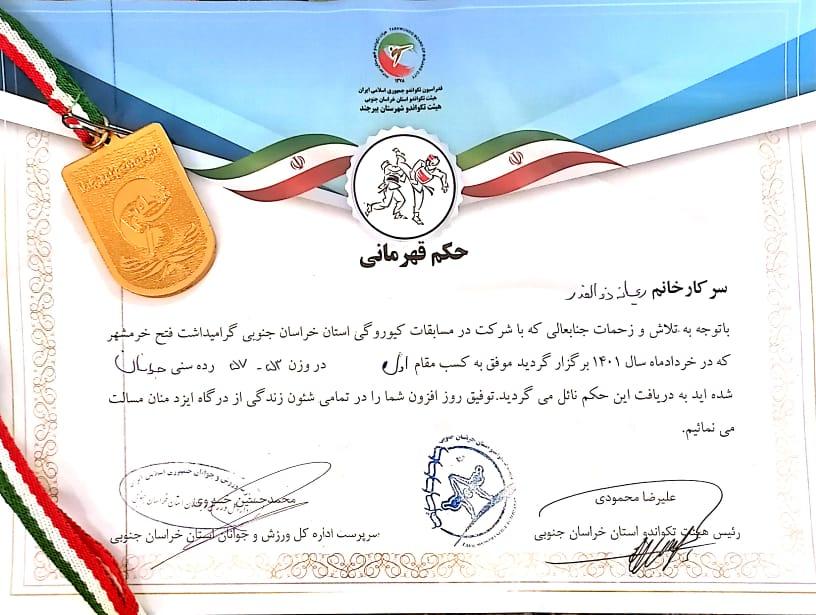 مسابقات کیوروگی استان خراسان جنوبی به مناسبت گرامیداشت فتح خرمشهر در خردادماه 1401 برگزار گردید. حکم قهرمانی این مسابقات در مردادماه سال جاری با امضای سرپرست اداره کل ورزش و جوانان استان و رئیس هیئت تکواندو خراسان جنوبی به ریحانه ذوالقدر اهدا شد.