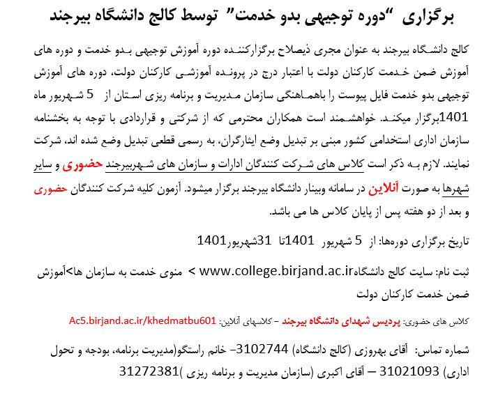 کالج دانشـگاه بیرجند به عنوان مجری ذیصلاح برگزارکننـده دوره آموزش توجیهی بـدو خدمت و دوره های آموزش ضمن خـدمت کارکنان دولت با اعتبار درج در پرونـده آموزشـی کارکنان دولت، دوره های آموزش توجیهی بدو خدمت همکاران تازه استخدامی را باهمـاهنگی سازمان مـدیریت و برنامه ریزی اسـتان از 5 شـهریور1401برگزار میکنـد.