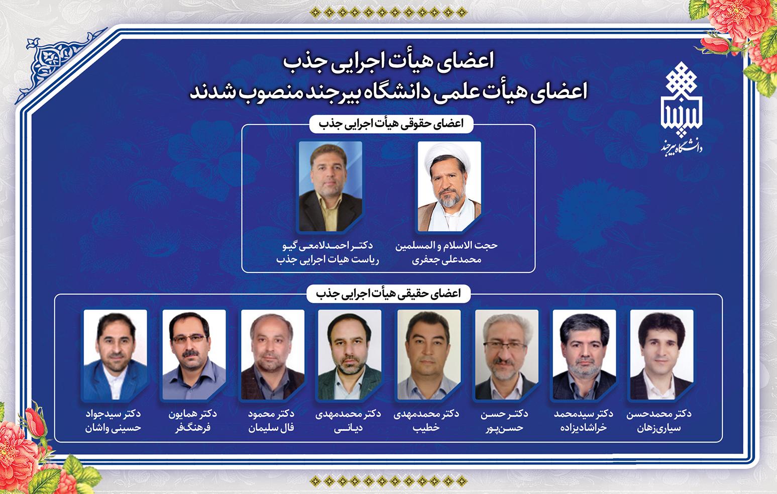 دکتر امیرحسینی، رئیس مرکز جذب اعضای هیأت علمی وزارت علوم، تحقیقات و فناوری در نامه‌ای ضمن معرفی اعضای حقیقی هیأت اجرایی به دکتر لامعی؛ سرپرست دانشگاه بیرجند، آورده است؛ عطف به پیشنهاد سرپرست محترم دانشگاه مبنی بر معرفی اعضای هیأت اجرایی جذب و طبق مصوبات هیأت عالی جذب شورای انقلاب فرهنگی، اعضای این هیأت مطابق مصوبه هیأت عالی جذب معرفی می‌شوند. براساس این مصوبه دکتر سیدجواد حسینی‌واشان، دکتر همایون فرهنگ‌فر، دکتر  محمود فال سلیمان، دکتر محمدمهدی دیانی، دکتر محمدمهدی خطیب، دکتر حسن حسن‌پور، دکتر سیدمحمد خراشادیزاده و دکتر محمدحسن سیاری‌زهان به عنوان اعضای حقیقی هیأت اجرایی جذب معرفی شدند. دکتر لامعی ؛ سرپرست دانشگاه و حجت الاسلام و المسلمین محمدعلی جعفری؛ مسئول نهاد نمایندگی مقام معظم رهبری در دانشگاه بیرجند اعضای حقوقی هیأت اجرایی جذب هستند. ریاست هیأت اجرایی جذب بر عهده سرپرست دانشگاه بیرجند است.