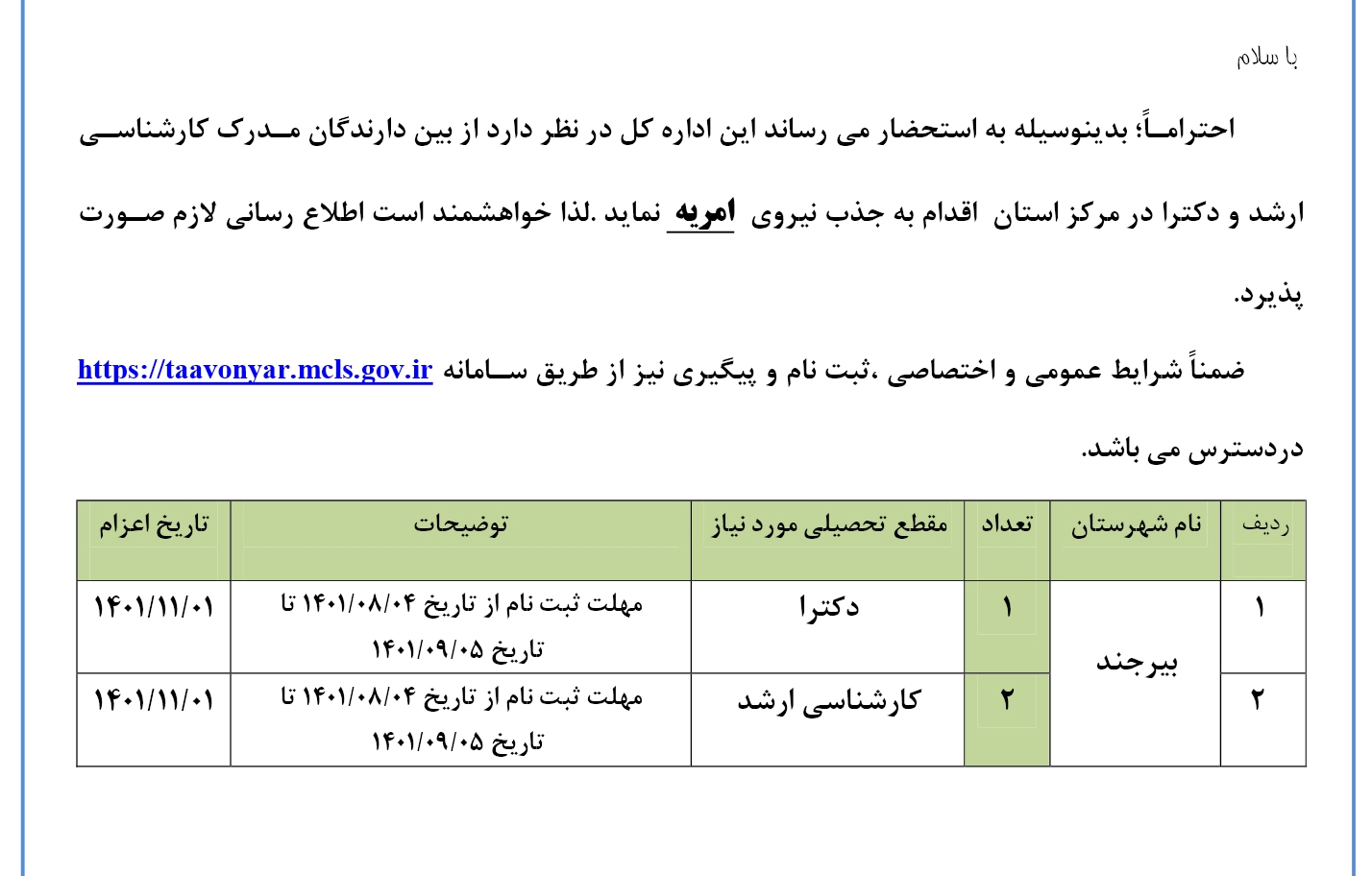 اداره کل تعاون کار و رفاه اجتماعی خراسان جنوبی  در نظر دارد از بین دارندگان مدرک کارشناسی ارشد و دکتری اقدام به جذب امریه از طریق سامانه به نشانی www.taavonyar.mcls.gov.ir (https://taavonyar.mcls.gov.ir/) نماید.  شرایط عمومی و اختصاصی از جمله معدل، رشته و ... در سامانه فوق قابل مشاهده خواهد بود.