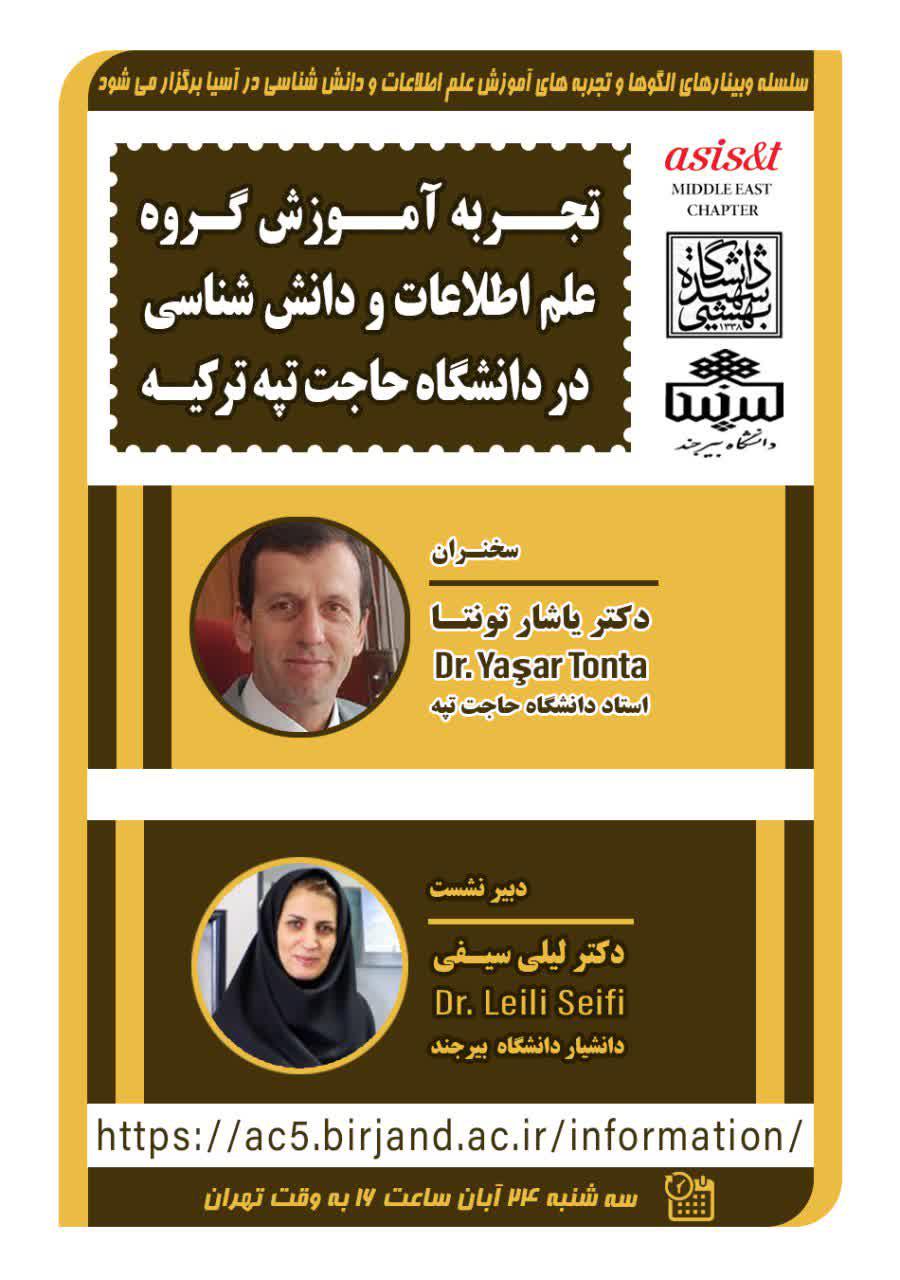 گروه علم اطلاعات و دانش شناسی با مشارکت بخش خاورمیانه انجمن علوم اطلاعات و فناوری آمریکا و گروه آموزشی علم اطلاعات و دانششناسی دانشگاه شهید بهشتی، سومین وبینار با عنوان تجربه آموزش علم اطلاعات و دانششناسی دانشگاه حاجت تپه ترکیه با سخنرانی دکتر یاشار تونتا استاد دانشگاه حاجت تپه در تاریخ سه شنبه 24 آبان ماه  ساعت 16 به وقت تهران را برگزار می کند. دبیر این وبینار دکتر لیلی سیفی عضو هیئت علمی دانشگاه بیرجند می‌باشد.