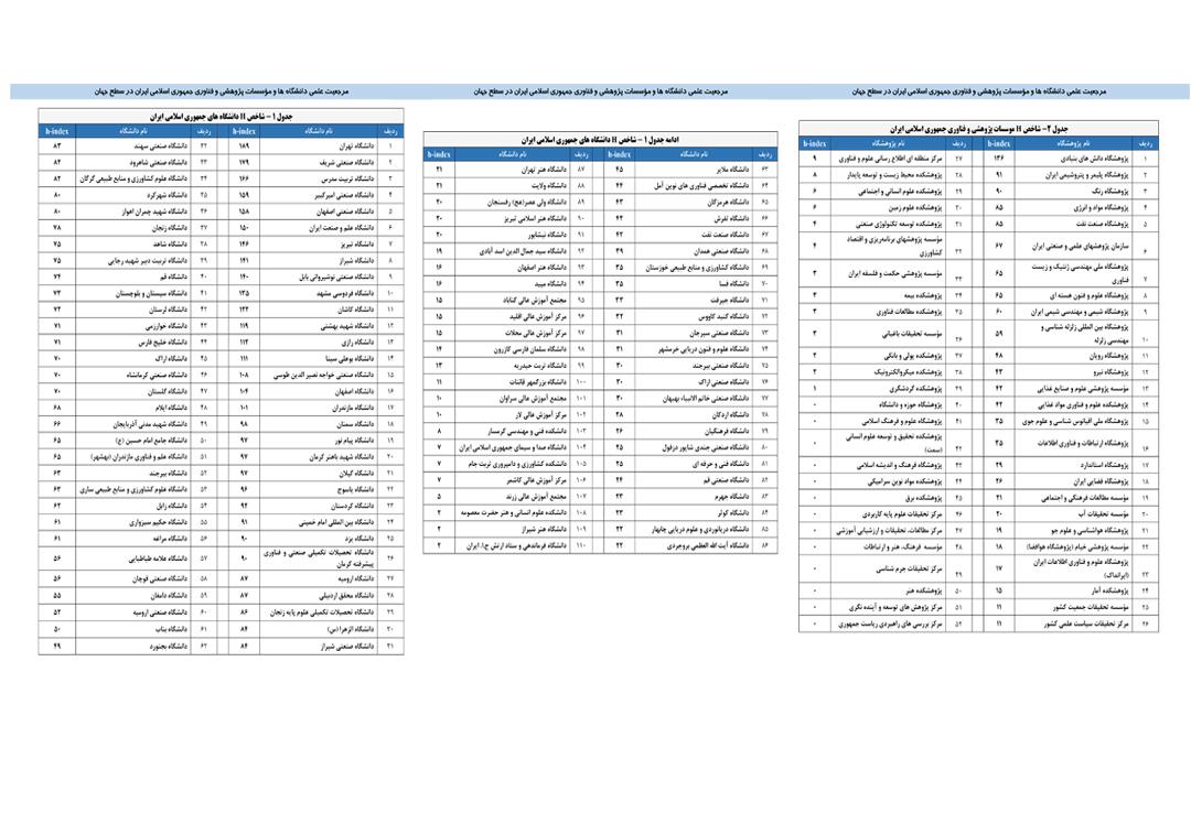 لازم به توضیح است؛ دانشگاه‌های تهران با شاخص H 189، صنعتی شریف با شاخص H 179، تربیت مدرس با شاخص H 166، صنعتی امیر کبیر با شاخص H 159 و صنعتی اصفهان با شاخص H 158 جزو 5 دانشگاه برتر ایران در این بررسی بودند.