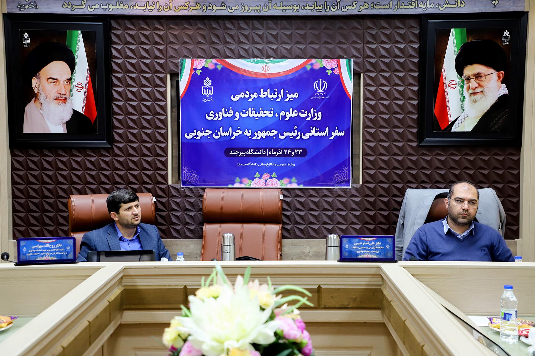 به گزارش روابط عمومی و اطلاعرسانی دانشگاه بیرجند، همزمان با سفر رئیس جمهور و هیأت دولت به استان خراسان جنوبی، میز ارتباط مردمی وزارت علوم، تحقیقات و فناوری با حضور دکتر روح الله سهرابـی، نماینده تام الاختیار وزیر علوم، تحقیقات و فناوری و سرپرست دفتر بازرسی وزارت علوم، تحقیقات و فناوری و دکتر علی اصغر طیبی، نماینده دفتر بازرسی و پاسخگویی به شکایات وزارت علوم، تحقیقات و فناوری در دانشگاه بیرجند مستقر است.