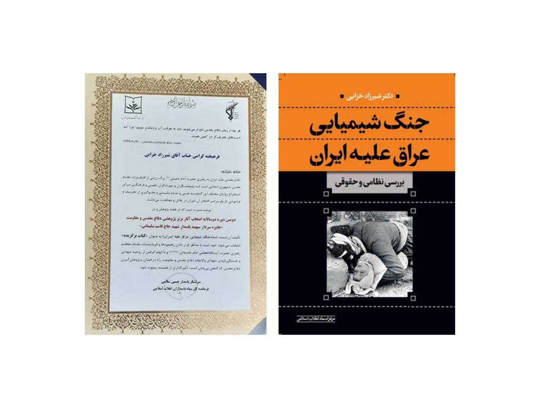 در این مراسم کتاب " جنگ شیمیایی عراق علیه ایران" تألیف دکتر شیرزاد خزاعی، عضو هیأت علمی گروه تاریخ دانشکده ادبیات و علوم انسانی دانشگاه بیرجند به عنوان کتاب برگزیده انتخاب شد. در بخشی از این تقدیرنامه که با امضای سرلشگر پاسدار حسین سلامی، فرمانده کل سپاه پاسداران انقلاب اسلامی صادر شده، آمده است؛ موجب مسرت است که در هفته پژوهش و در دومین دوره دوسالانه انتخاب آثار برتر پژوهشی دفاع مقدس و مقاومت«جایزه سردار سپهبد پاسدار شهید حاج قاسم سلیمانی» تألیف ارزشمند شما (جنگ شیمیایی عراق علیه ایران) به عنوان کتاب برگزیده انتخاب میشود.