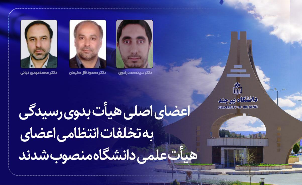 طی این احکام، دکتر محمدمهدی دیانی، دکتر محمود فال سلیمان و دکتر سیدمحمد رضوی به مدت دو سال به عنوان عضو اصلی هیأت بدوی رسیدگی به تخلفات انتظامی اعضای هیأت علمی دانشگاه بیرجند منصوب شدند. همچنین دکتر محمدحسن سیاریزهان و دکتر حسن حسنپور نیز به عنوان اعضای علی البدل هیأت بدوی رسیدگی به تخلفات انتظامی اعضای هیأت علمی دانشگاه معرفی شدند.