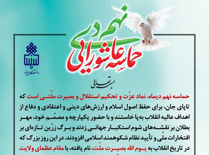 حماسه نهم دیماه، نماد عزّت و تحکیم استقلال و بصیرت ملّتی است که تا پای جان، برای حفظ اصول اسلام و ارزش های دینی و اعتقادی و دفاع از اهداف عالیه انقلاب به پا خاستند و با حضور یکپارچه و مصمّم خود، مهر بطلان بر نقشه های شوم استکبار جهانی زدند و برگ زرّین تازه ای بر افتخارات ملّی و تایید نظام شکوهمند اسلامی افزودند. در این روز بزرگ که در تاریخ انقلاب به یوم الله بصیرت ملّت، نام یافته، با مقام عظمای ولایت میثاق می بندیم که با تلاش و همّت در مسیر پیشرفت و اعتلای ایران عزیز بکوشیم و از آرمان های شهدای به خون خفته این سرزمین و مکتب سردار دل ها، حاج قاسم سلیمانی و دستاوردهای ارزشمند نظام شرافتمندانه، حراست و صیانت نماییم.