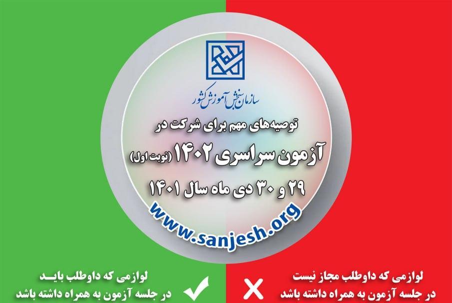 توصیه های مهم برای شرکت در آزمون سراسری ۱۴۰۲ (نوبت اول) ۲۷ دی ۱۴۰۱ | ۰۱:۳۶ کد : ۲۲۴۷۸ اطلاعیه ها اخبار ستادی اخبار دانشجویان ارسال به دیگران نام شما ایمیل شما ایمیل دریافتکننده ارسال انصراف تعداد بازدید:۶۴۸۰