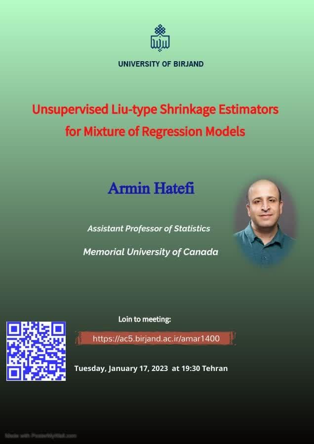سخنرانی تخصصی با عنوان Unsupervised Liu-type Shrinkage Estimators for Mixture of Regression Models به صورت مجازی بعدازروز سه شنبه 27 دی ماه جاری توسط دکتر آرمین هاتفی، استادیار دانشگاه مموریال کانادا برگزار شد.