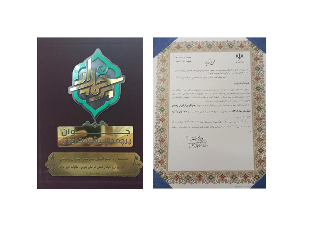 در لوح تقدیر اهدایی به مهندس پاسبان که با امضای دکتر جواد قناعت، استاندار خراسان جنوبی صادره شده، آمده است؛ نظر به رأی شورای داوری از جنابعالی که در "جشنواره جوانان برتر ایران زمین استان خراسان جنوبی سال 1401" حائز رتبه اول در موضوع تخصصی کارآفرینی شدهاید بعنوان "جوان برتر" تقدیر بعمل میآورم.
