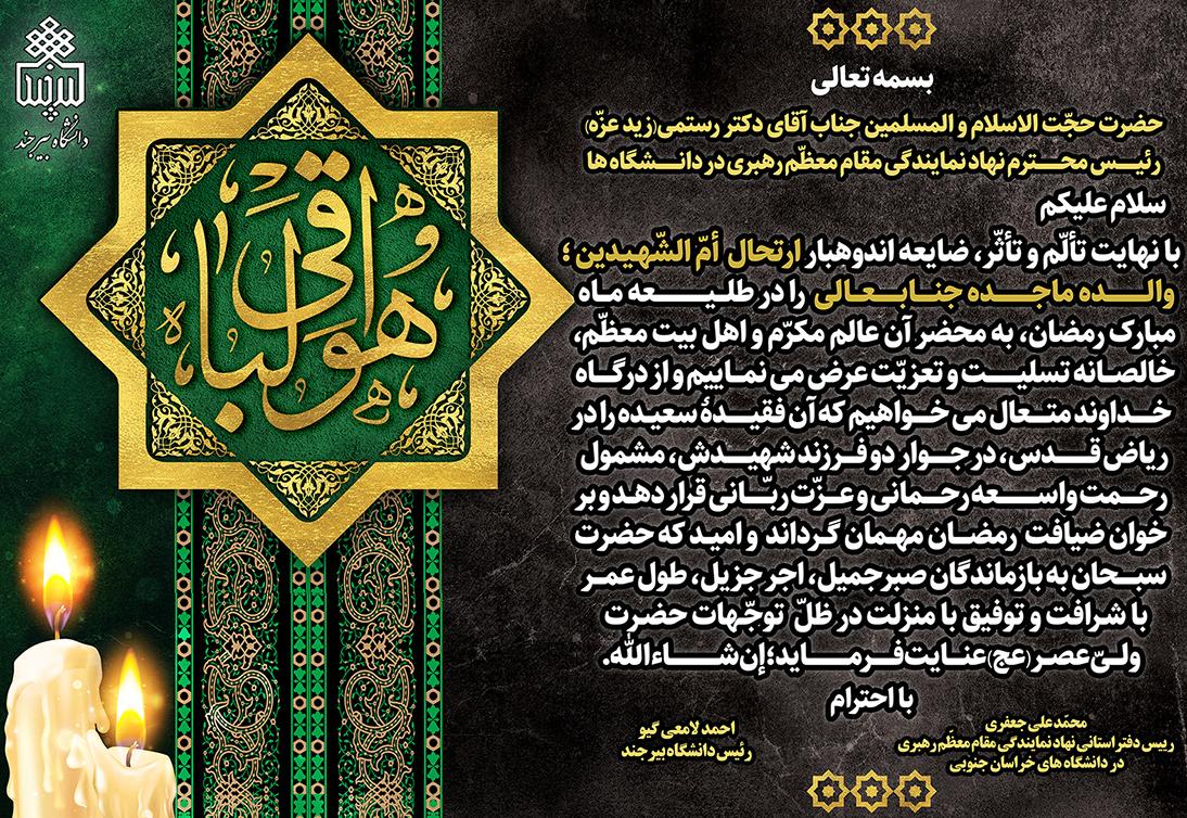 پیام تسلیت رئیس دفتر استانی نهاد نمایندگی مقام معظم رهبری در دانشگاههای استان و رئیس دانشگاه بیرجند در پی ارتحال والده ماجده حضرت حجت الاسلام و المسلمین جناب آقای دکتر رستمی (زیدعزّه) رئیس محترم نهاد نمایندگی مقام معظم رهبری در دانشگاهها