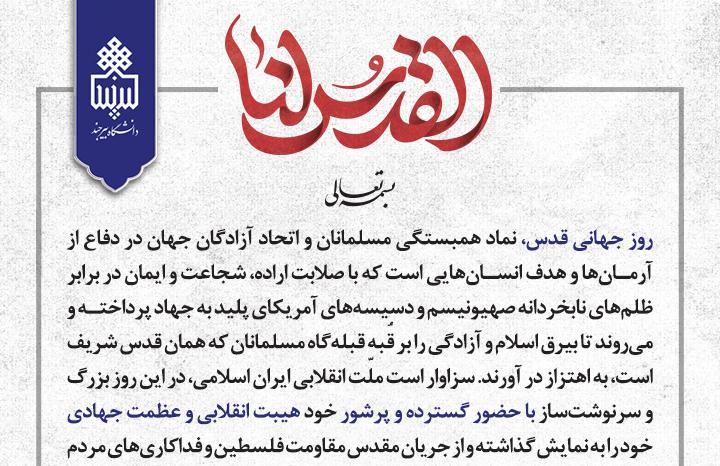 روز جهانی قدس، نماد همبستگی مسلمانان و اتحاد آزادگان جهان در دفاع از آرمانها و هدف انسـانهایی است که با صلابت اراده، شجاعت و ایمان در برابر ظلمهای نابخردانه صهیونیسم و دسیسههای آمریکای پلید به جهاد پرداخته و میروند تا بیرق اسلام و آزادگی را بر قُبه قبلهگاه مسلمانان که همان قدس شریف است، به اهتزاز در آورند. سزاوار است ملّت انقلابی ایران اسلامی، در این روز بزرگ و سرنوشتساز با حضور گسترده و پرشور خود هیبت انقلابی و عظمت جهادی خود را به نمایش گذاشته و از جریان مقدس مقاومت فلسطین و فداکاریهای مردم این سرزمین دفاع نماید و با حمایت خود، اندیشه مقاومت را به عنوان تنها راه پیروزی برسفاک صفتان تاریخ در تفکر جهانی تثبیت گرداند و یاد و خاطر مجاهدان این مسیر، بویژه مجاهدتهای زَعیم جبهه مقاومت، سردار دلها، شهید حاج قاسم سلیمانی را در روح و اراده نسل آینده زنده نگاه دارد. اینک خانواده دانشگاه بیرجند، در لبیک به رهنمودهای رهبر فرزانه و حکیم انقلاب و همگام با اقشار مختلف مردم انقلابـی استان بر خود فرض میداند در این راهپیمایـی شکوهمند که یادگار امام راحل عظیمالشأن است، شرکت جسته و با حضور خود وظیفه میهنی و دینی خود را نسبت به مردم مظلوم فلسطین و آزادی قدس شریف، به انجام رساند.