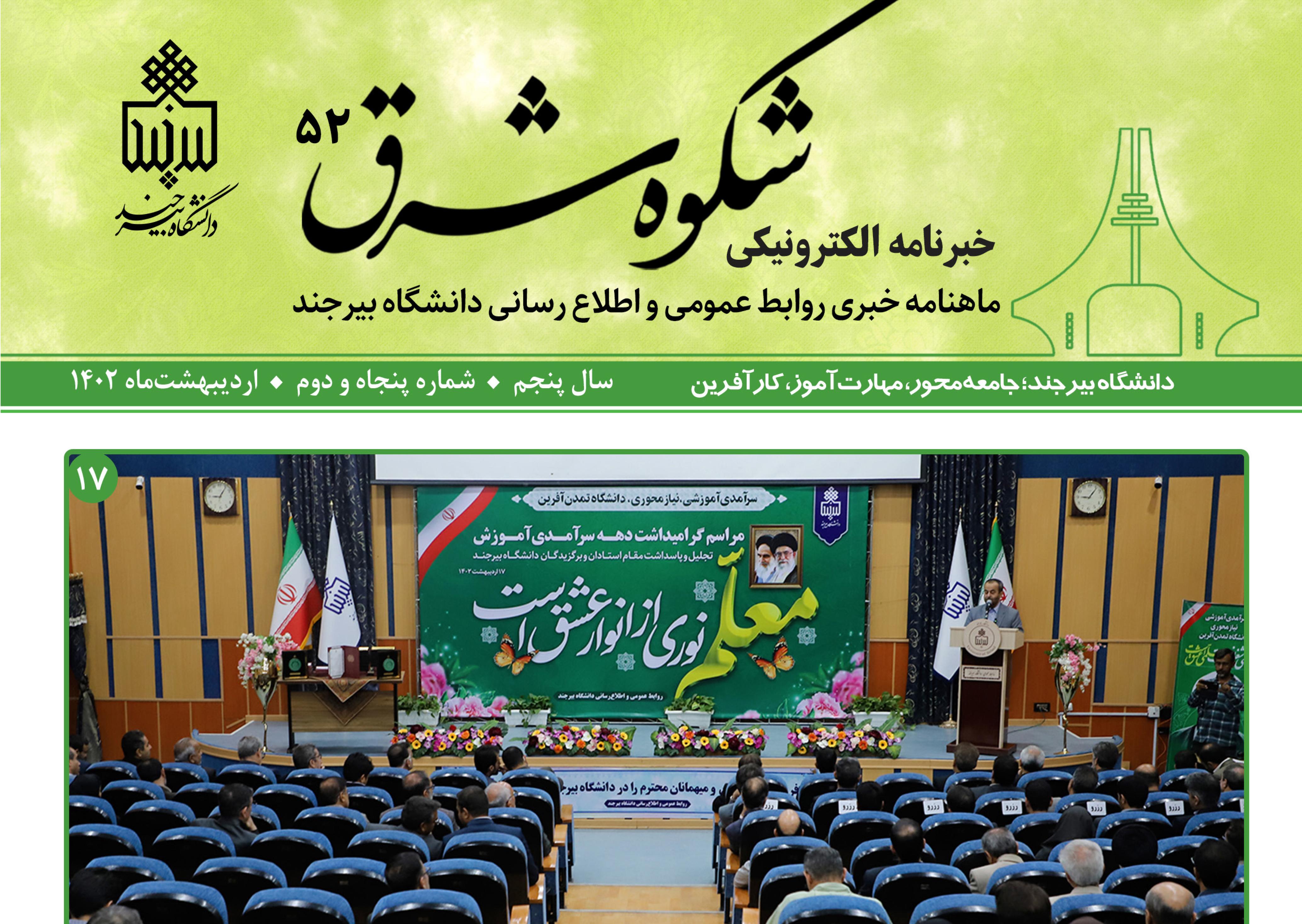 انتشار پنجاه و دومین خبرنامه شکوه شرق دانشگاه بیرجند ۰۲ خرداد ۱۴۰۲ | ۰۹:۰۲ کد : ۲۴۰۳۹ اخبار برگزیده خبرنامه شکوه شرق ارسال به دیگران نام شما ایمیل شما ایمیل دریافتکننده ارسال انصراف تعداد بازدید:۵۷۳۱ پنجاه و دومین خبرنامه شکوه شرق به همت روابط عمومی و اطلاعرسانی دانشگاه بیرجند ویژه اردیبهشتماه ۱۴۰۲ منتشر شد.