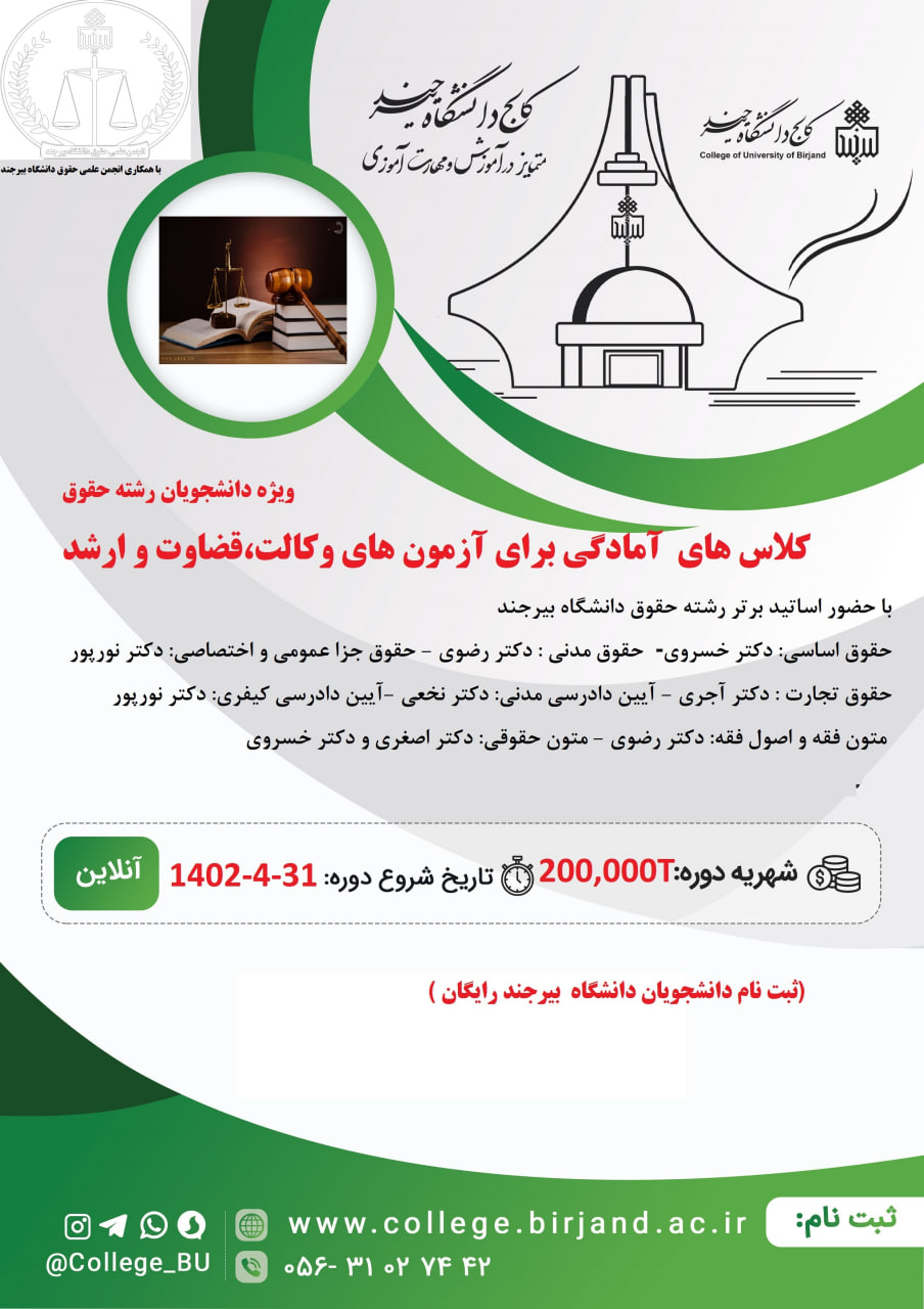 کلاسهای آمادگی برای آزمونهای وکالت، قضاوت و ارشد (ویژه دانشجویان رشته حقوق) ۲۰ تیر ۱۴۰۲ | ۱۰:۲۸ کد : ۲۴۵۵۹ اطلاعیه ها ارسال به دیگران نام شما ایمیل شما ایمیل دریافتکننده ارسال انصراف تعداد بازدید:۴۷۵۹
