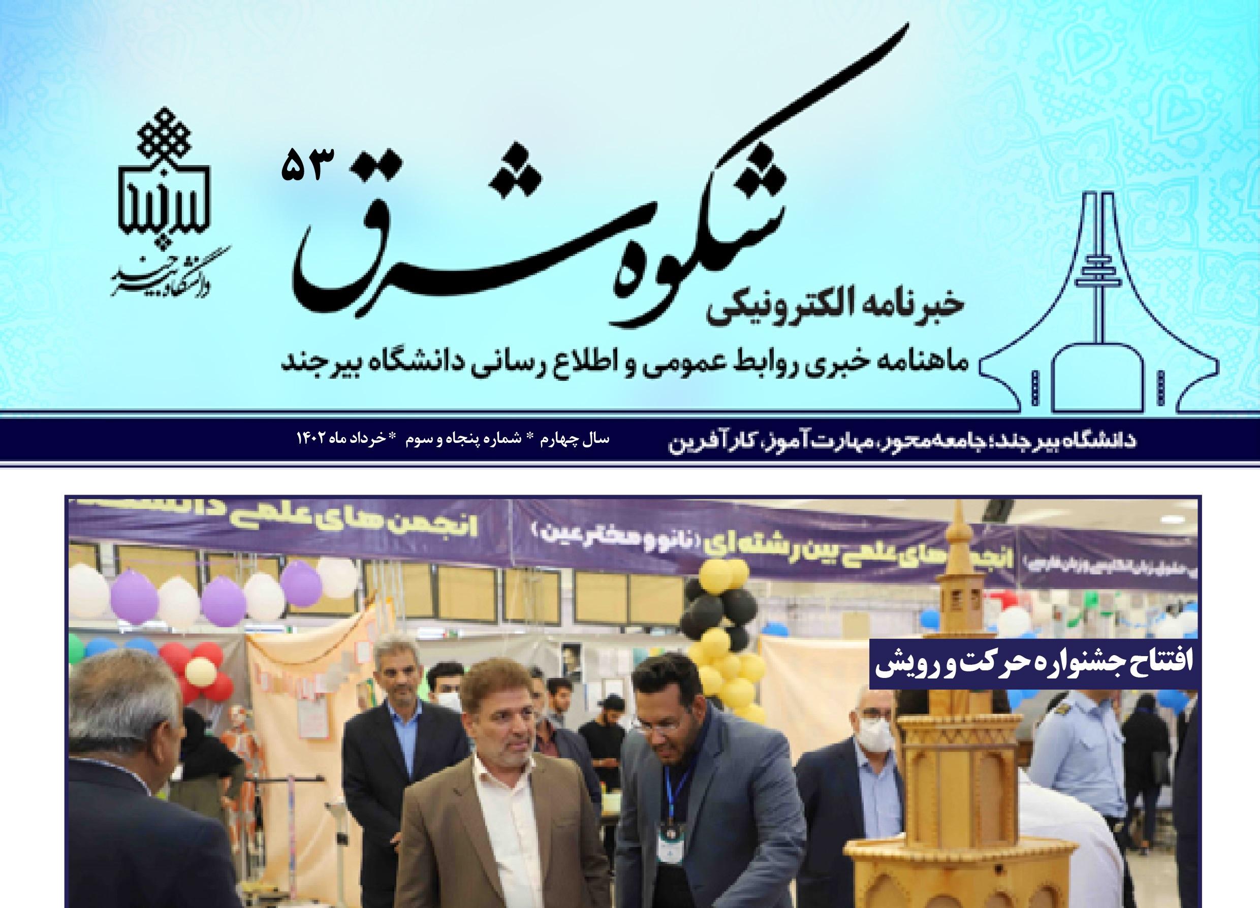 انتشار پنجاه و سومین خبرنامه شکوه شرق دانشگاه بیرجند ۰۱ تیر ۱۴۰۲ | ۰۹:۴۲ کد : ۲۴۵۸۸ اخبار برگزیده خبرنامه شکوه شرق ارسال به دیگران نام شما ایمیل شما ایمیل دریافتکننده ارسال انصراف تعداد بازدید:۴۸۵۵ پنجاه و سومین خبرنامه شکوه شرق به همت روابط عمومی و اطلاعرسانی دانشگاه بیرجند ویژه خردادماه ۱۴۰۲ منتشر شد.