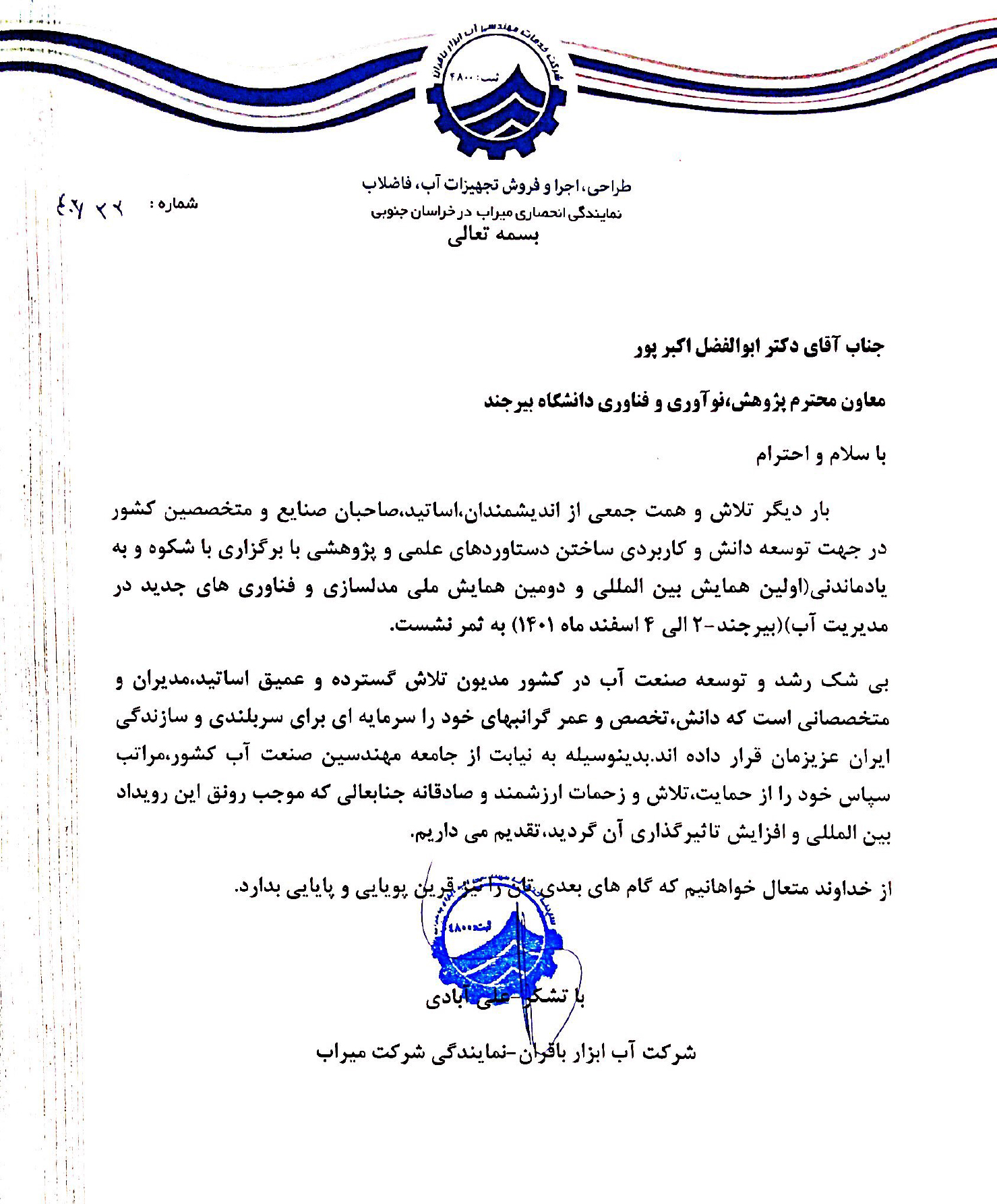 به گزارش روابط عمومی و اطلاع‌رسانی دانشگاه بیرجند، در متن تقدیر نامه ارسالی از سوی این شرکت ذکر شده است؛ بدین‌وسیله به نیابت از جامعه مهندسین صنعت آب کشور، مراتب سپاس خود را از حمایت، تلاش و زحمات ارزشمند و صادقانه جنابعالی که موجب رونق این رویداد بین المللی و افزایش تاثیرگذاری آن گردید، تقدیم می‌داریم. از خداوند متعال خواهانیم که گام‌های بعدی‌تان را نیز قرین پویایی و پایایی بدارد.