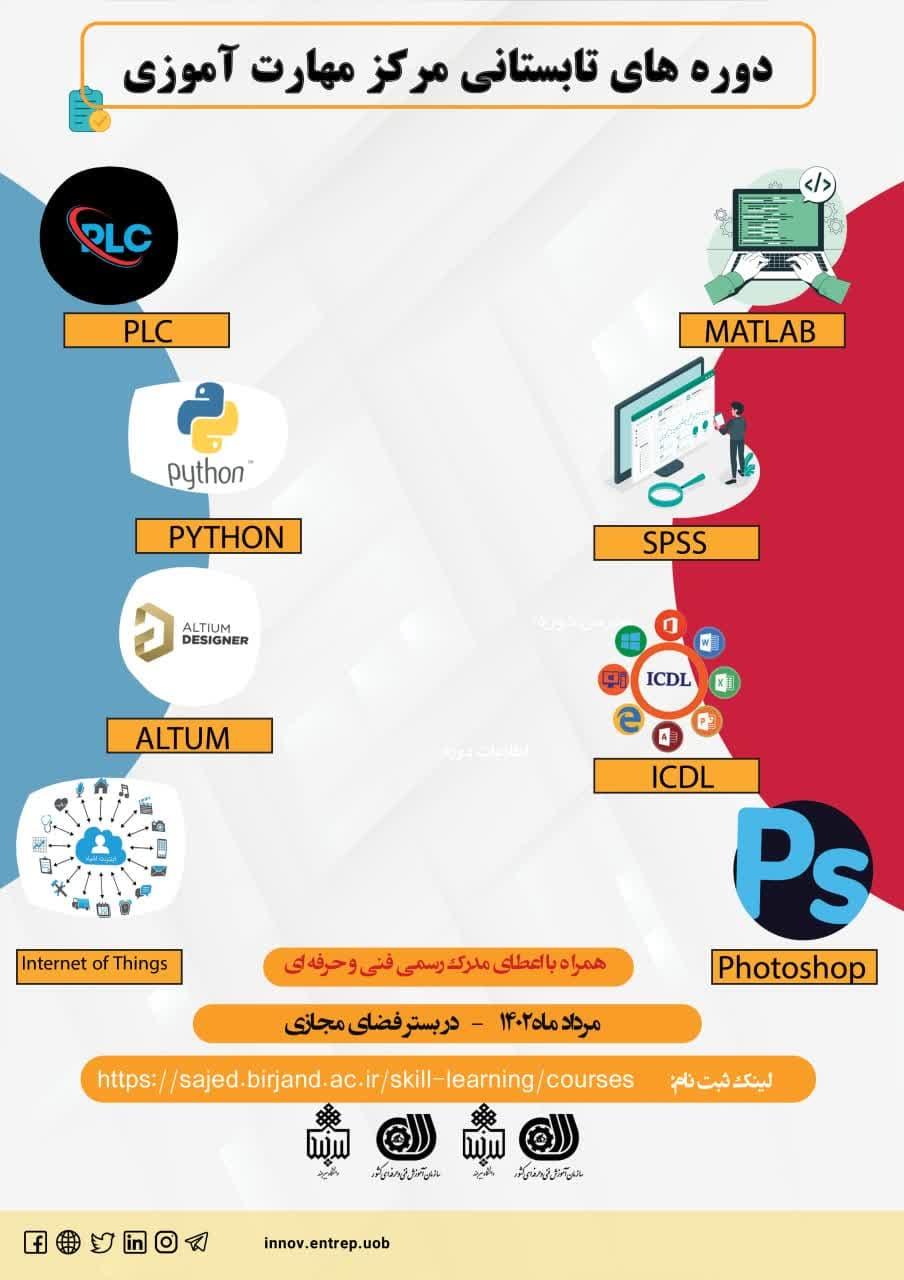 به گزارش روابط عمومی و اطلاع‌رسانی دانشگاه بیرجند، دوره تابستانه مرکز مهارت آموزی که از هفتم مرداد ماه 1402 آغاز شد، پس از گذشت 6 هفته به پایان رسید و در طی این مدت دوره‌های مجازی مختلف از جمله متلب، پایتون، PLC، ICDL، spss و فتوشاپ با حضور بیش از 100 دانشجو برگزار شد. این دوره ها در مردادماه به صورت مجازی و با هدف استفاده از اوقات فراغت تابستان و حفظ ارتباط دانشجویان با دانشگاه در مدت تابستان تعریف شدند.