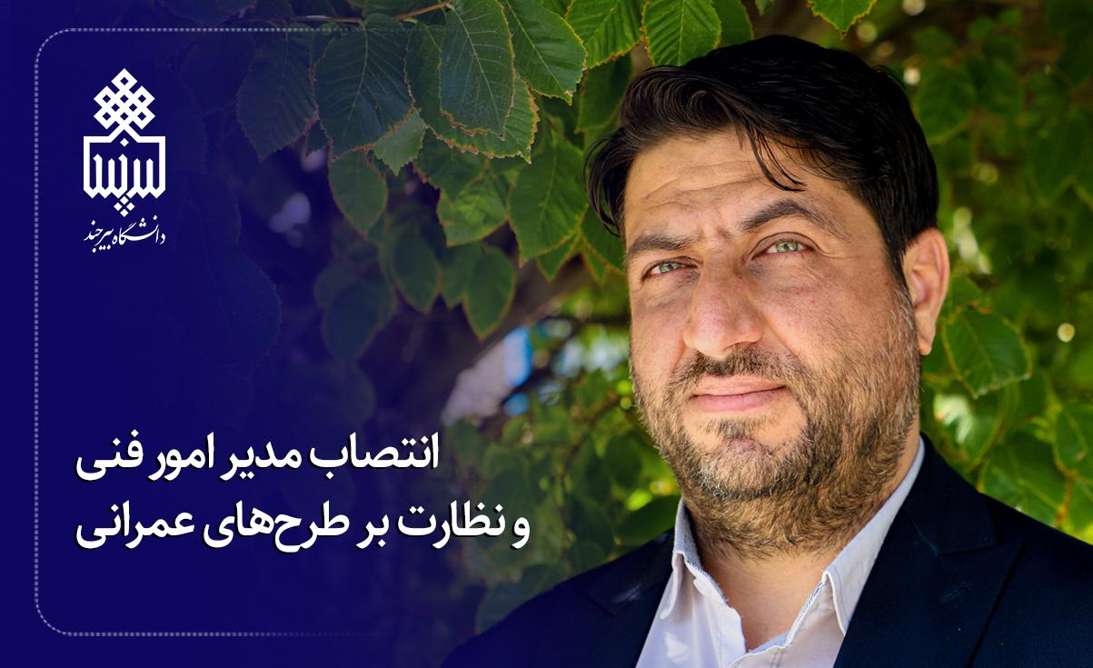 به گزارش روابط عمومی و اطلاع‌رسانی دانشگاه بیرجند، در حکم صادره از سوی رئیس دانشگاه به  مدیر امور فنی و نظارت بر طرح‌های عمرانی آمده است؛ با توجه به مراتب اخلاص و تخصص جنابعالی، از تاریخ خاتمه حکم قبلی به مّدت دو سال به سمت مدیر امور فنی و نظارت بر طرح‌های عمرانی دانشگاه منصوب می‌شویـد. امید است با تدبیر و درایت کامل و برنامه‌ریزی دقیق و مدون براساس نقشه جامع دانشگاه و عنایت لازمه نسبت به نظارت دقیق بر طرح‌های عمرانی و تأسیسات فّنی و انجام طرح‌های نیمه تمام برابر شرح وظایف پیوست به عمل آورید.