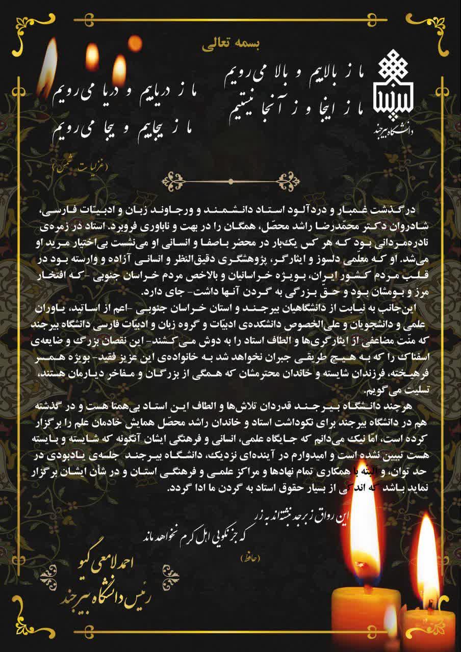 پیام تسلیت رئیس دانشگاه بیرجند به مناسبت درگذشت استاد دانشمند زبان و ادبیات فارسی شادروان دکتر محمدرضا راشدمحصل