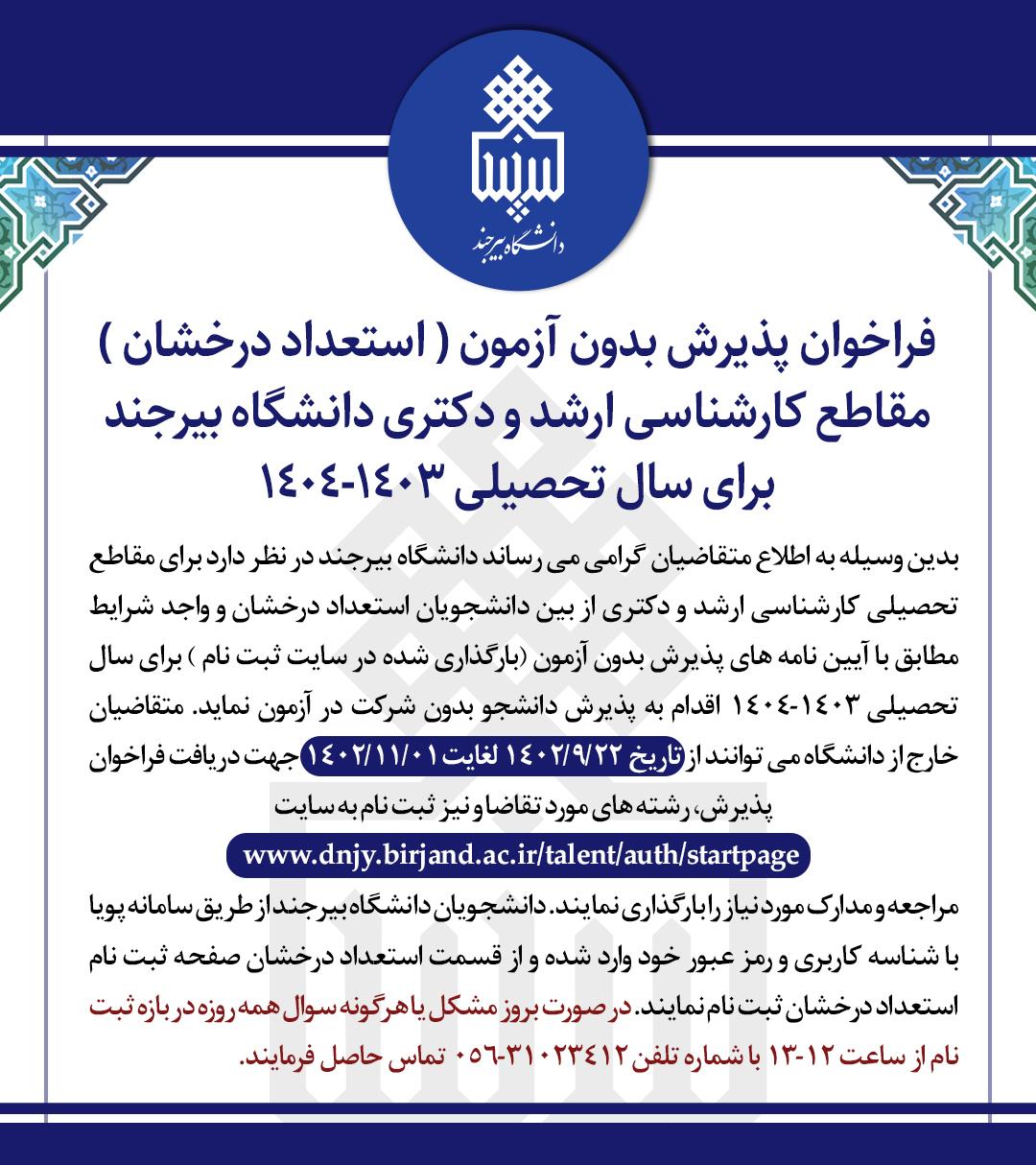 بدین وسیله به اطلاع متقاضیان گرامی میرساند دانشگاه بیرجند در نظر دارد برای مقاطع تحصیلی کارشناسی ارشد و دکتری از بین دانشجویان استعداد درخشان و واجد شرایط مطابق با آیین نامه های پذیرش بدون آزمون (بارگذاری شده در سایت ثبت نام ) برای سال تحصیلی 1403-1404 اقدام به پذیرش دانشجو بدون شرکت در آزمون نماید. متقاضیان خارج از دانشگاه می توانند از تاریخ 1402/09/22لغایت 1402/11/01 جهت دریافت فراخوان پذیرش، رشته های مورد تقاضا و نیز ثبت نام به سایت www.dnjy.birjand.ac.ir/talent/auth/startpage مراجعه و مدارک مورد نیاز را بارگذاری نمایند. دانشجویان دانشگاه بیرجند از طریق سامانه پویا با شناسه کاربری و رمز عبور خود وارد شده و از قسمت استعداد درخشان صفحه ثبت نام استعداد درخشان ثبت نام نمایند. در صورت بروز مشکل یا هرگونه سوال همه روزه در بازه ثبت نام از ساعت 12-13 با شماره تلفن 31023412-056 تماس حاصل فرمایند.