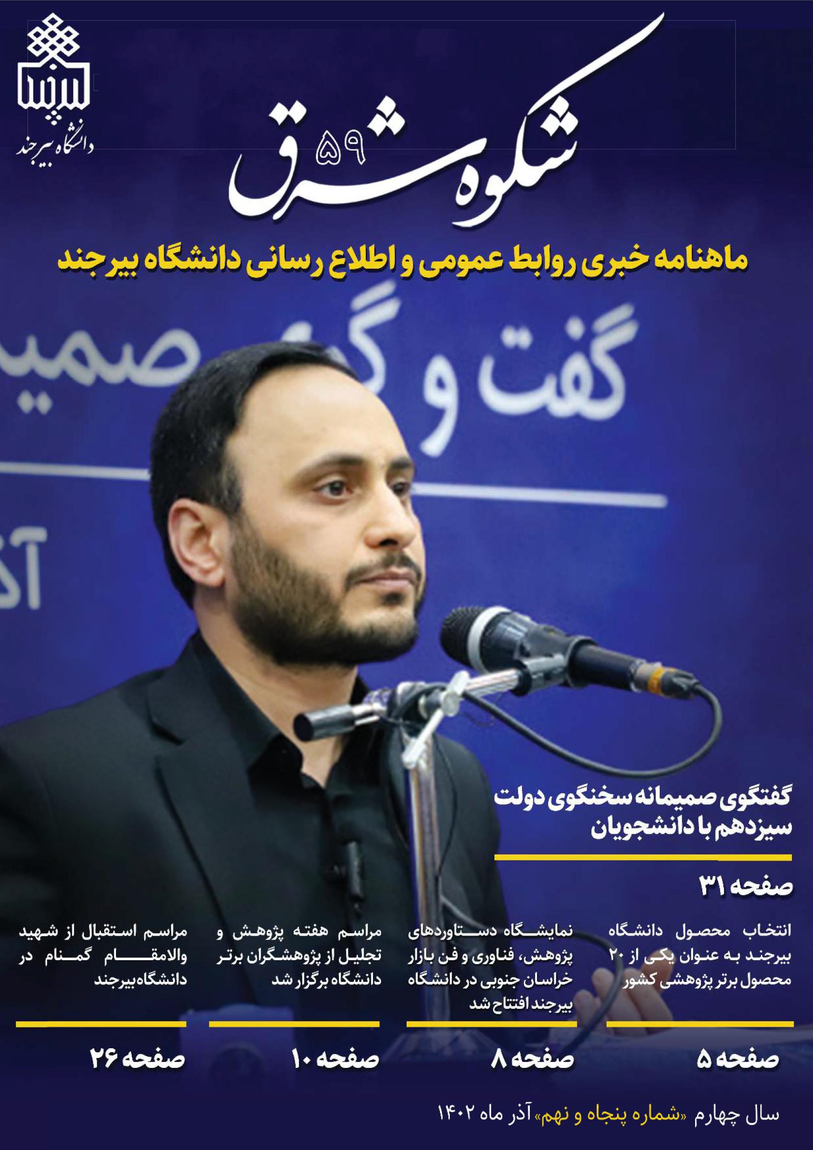 انتشار پنجاه و نهمین خبرنامه شکوه شرق دانشگاه بیرجند ۱۱ دی ۱۴۰۲ | ۰۸:۳۳ کد : ۲۶۵۴۸ اخبار برگزیده خبرنامه شکوه شرق ارسال به دیگران نام شما ایمیل شما ایمیل دریافتکننده ارسال انصراف تعداد بازدید:۴۸۵۳ پنجاه و نهمین خبرنامه شکوه شرق به همت روابط عمومی و اطلاعرسانی دانشگاه بیرجند ویژه آذرماه ۱۴۰۲ منتشر شد.