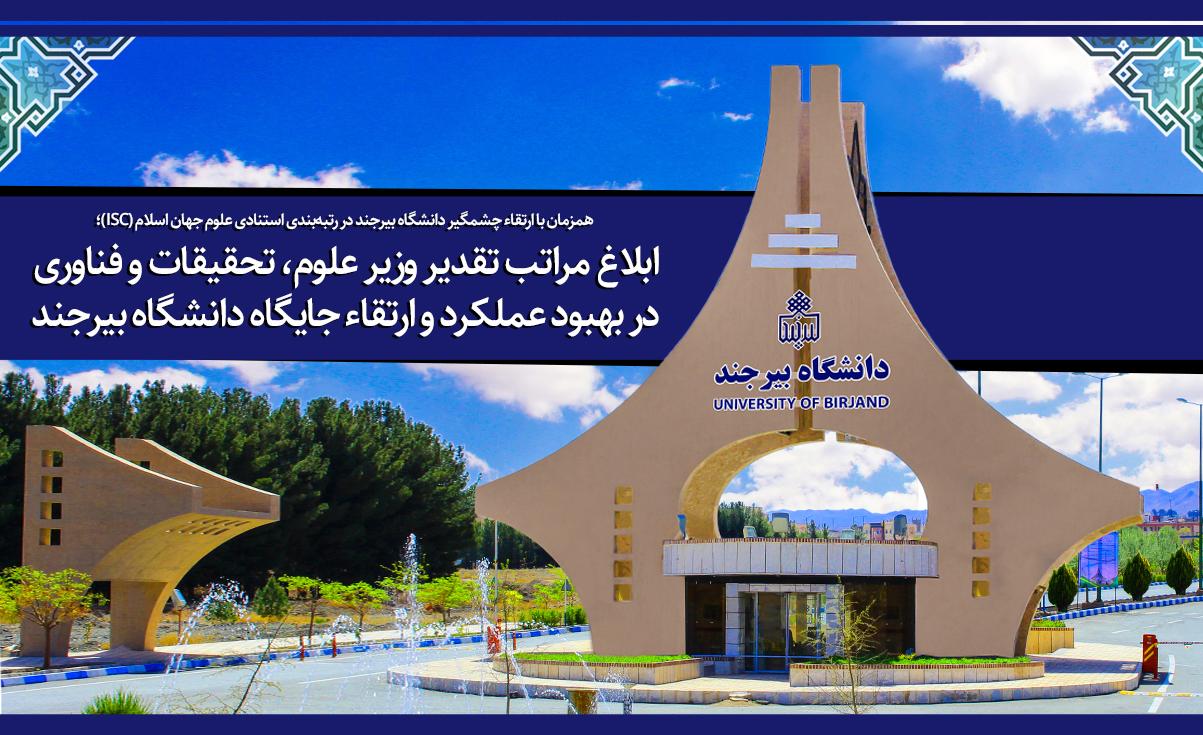 به گزارش روابط عمومی و اطلاع‌رسانی دانشگاه بیرجند، در تقدیرنامه صادره از سوی دکتر شمسی‌پور، مدیرکل حوزه وزارتی به دکتر احمد لامعی‌گیو، رئیس دانشگاه، آمده است؛ باعنایت به انتشار رتبه‌بندی دانشگاه‌های کشور در سال 1401 توسط مؤسسۀ استنادی و پایش علم و فناوری جهان اسلام (ISC) و با عنایت به ارتقاء 14 رتبه‌ای جایگاه آن دانشگاه در سال 1401 نسـبت به سال 1400، بدینوسـیله مراتب تقدیر و تشکر وزیر محترم علوم، تحقیقات و فنـاوری از عملکرد ارزنـده و تأثیرگـذار جنابعالی و همکاران محترم آن دانشـگاه که موجب بهبود عملکرد و ارتقاء جایگاه دانشگاه بیرجند در رتبه‌بندی دانشگاه‌های کشور شده است، ابلاغ می‌شود.